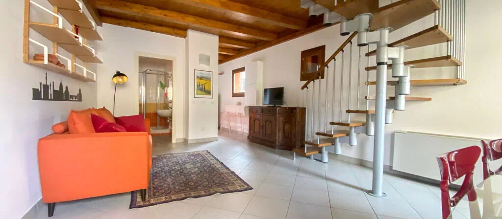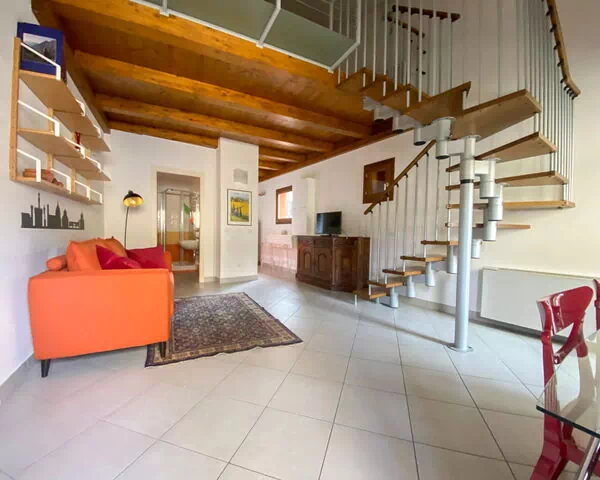 L'appartement Orcagna s'étend sur 2 niveaux, totalisant 58 m², et accueille un maximum de 2 hôtes. Il comprend 1 chambre et 1 salle de bains. Le rez-de-chaussée propose un séjour-salle à manger lumineux avec kitchenette, ainsi qu'une salle de bains avec douche, bidet et WC. Depuis le séjour, un accès direct mène à un balcon meublé. Le premier étage est constitué d'une galerie ouverte abritant 1 lit double, complétée d'un WC séparé. L'appartement a été rénové en 2023 et dispose d'un mobilier soigneusement sélectionné.