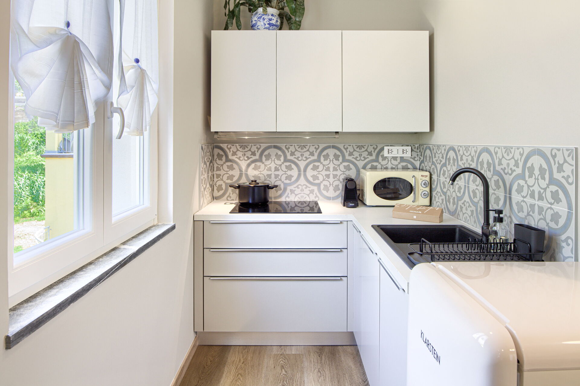 - Une pièce à vivre avec kitchenette, équipée de plaques à induction, four combiné (micro-ondes + grill), évier, réfrigérateur avec compartiment congélateur, cafetière Nespresso, cafetière américaine, Moka italien, bouilloire électrique. Lave-vaisselle. Table à manger avec 4 chaises.