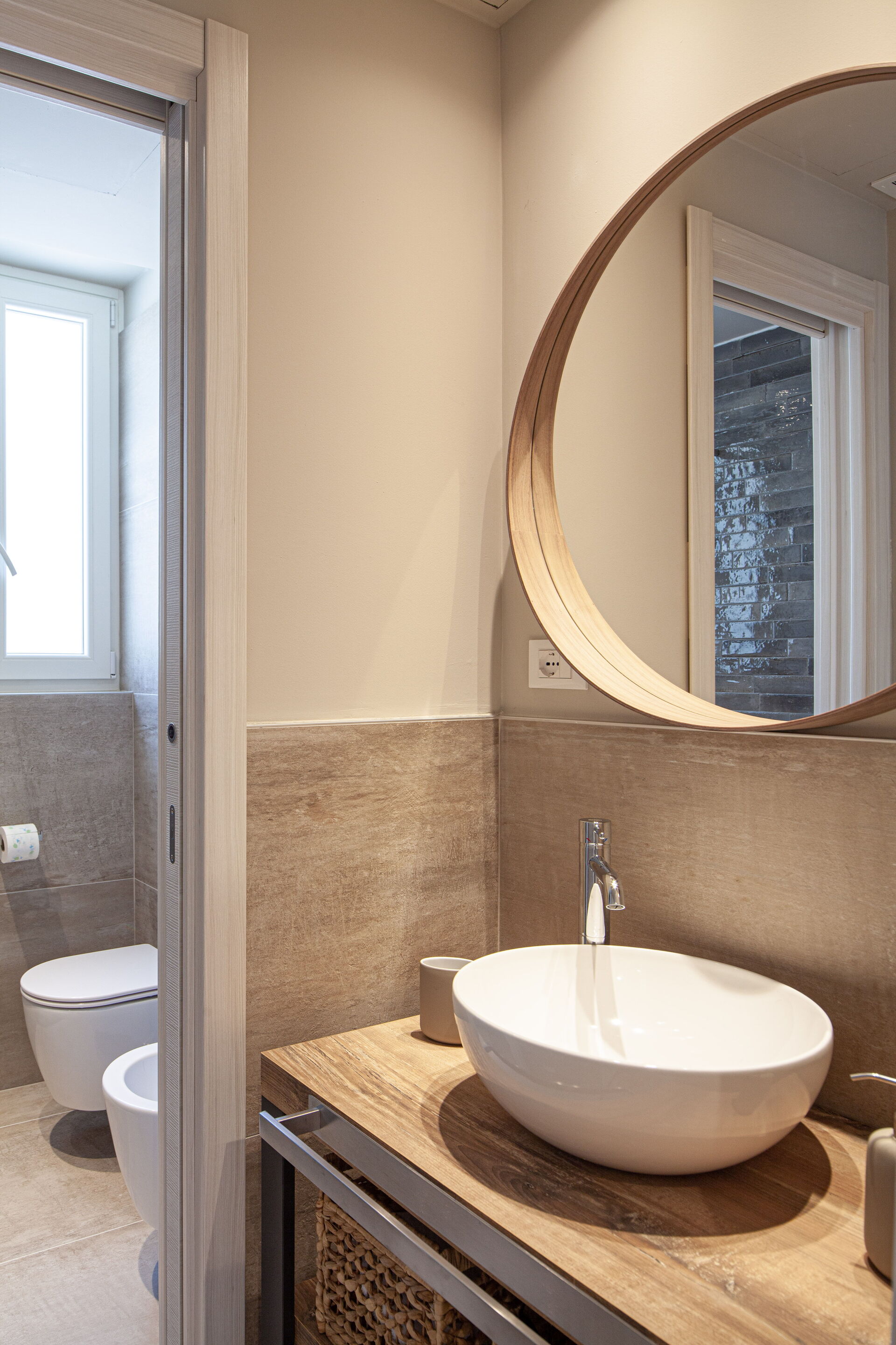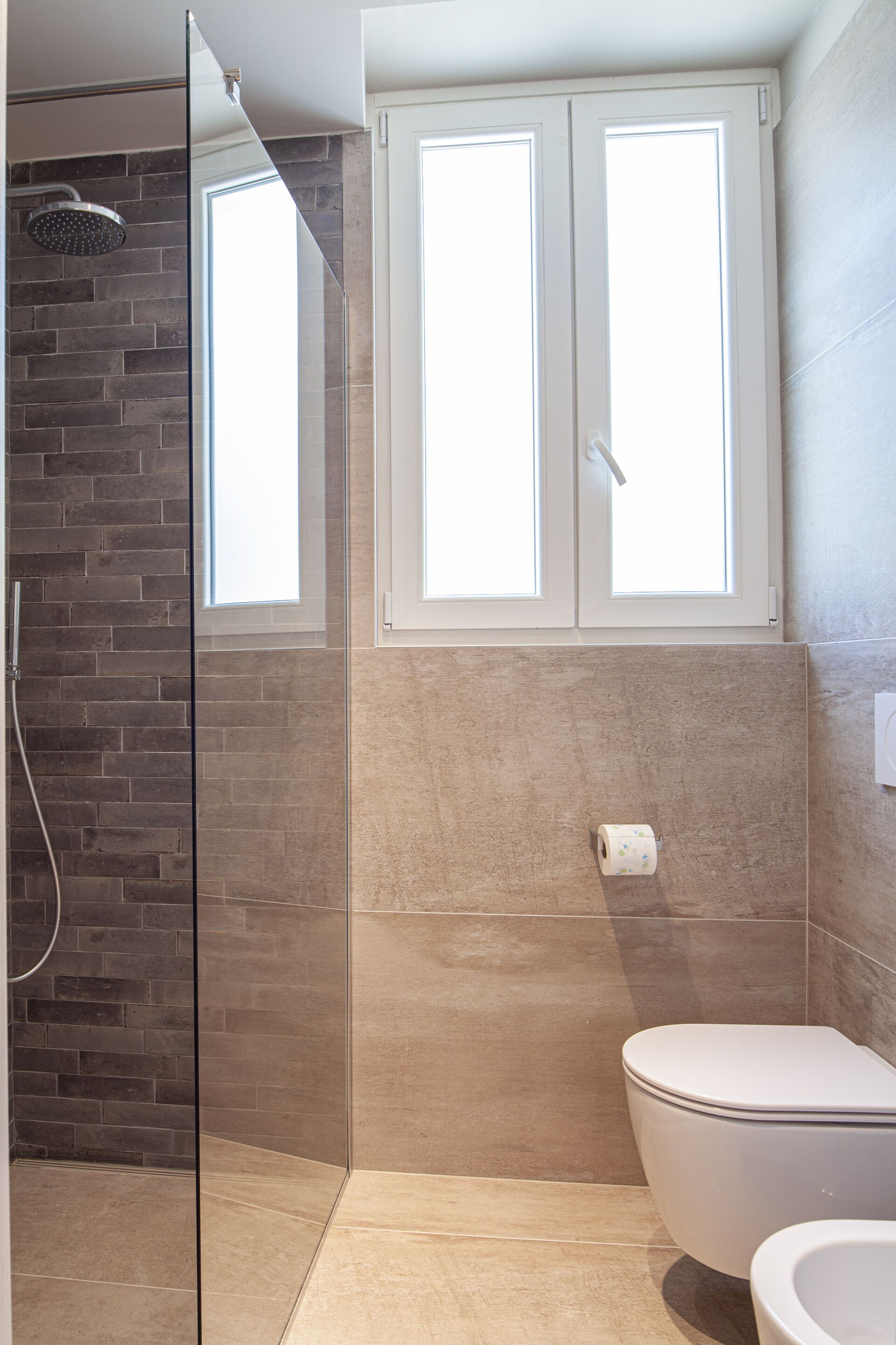- Salle de bain avec lavabo, douche, toilette et bidet.