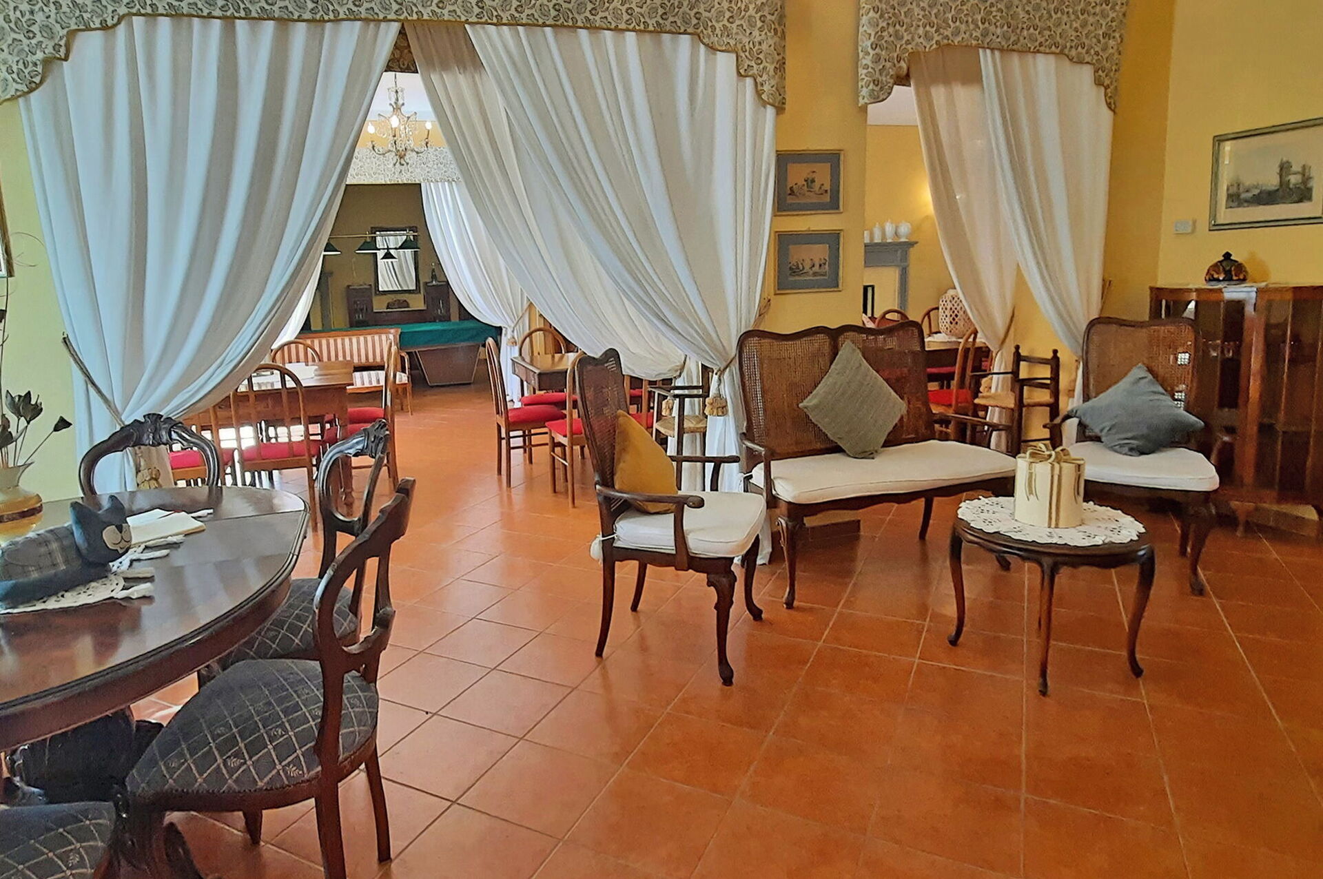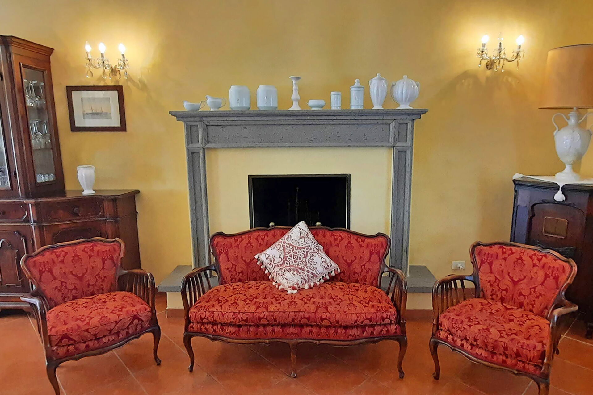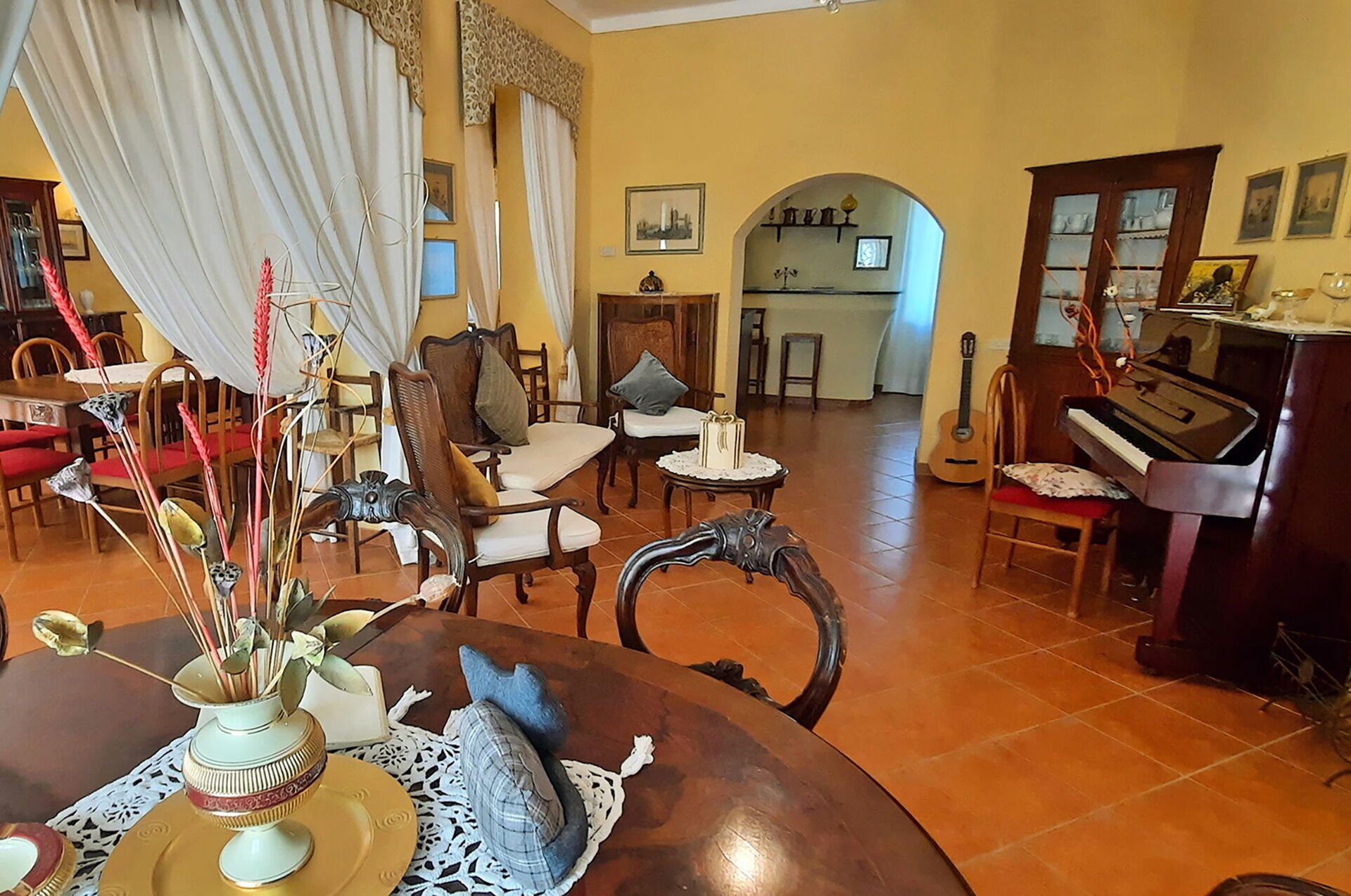 On the ground floor there are three large rooms, two of which with stone fireplaces and one with a piano. The lounges allow direct access to the semicircular terracotta solarium. Also on the ground floor there are two double bedroom with private bathroom with shower.