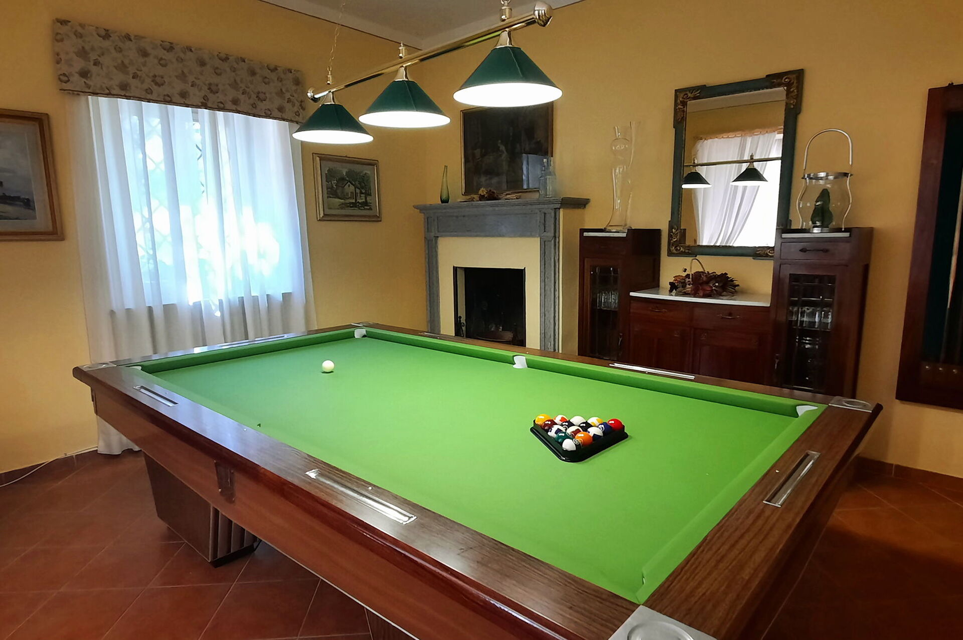 On the ground floor a study, a cozy bar area with professional espresso machine and a well equipped kitchen, with dishwasher, two refrigerators, a freezer, electric oven, microwave, 2 kettles, 2 toasters, juicer. On the ground floor there is also an ironing room / wardrobe, a small living room with TV, billiard room, fitness room, relax room with ping-pong and a bathroom with shower.