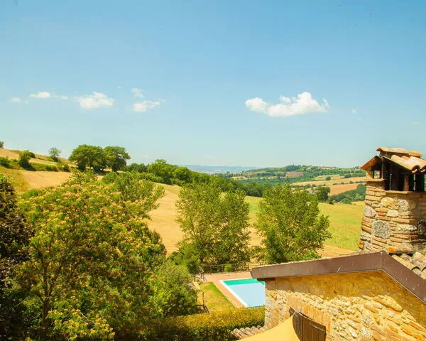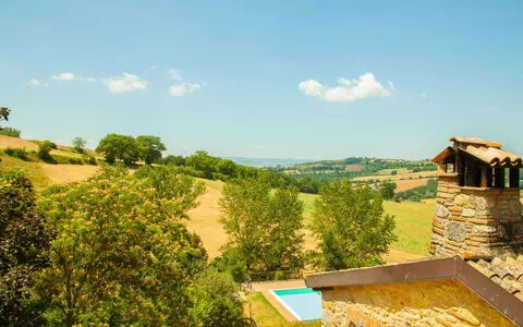 Maison de campagne individuelle "Tra Cielo e Terra", environnée par les prés et champs. À 10 km du centre de Todi, situation isolée. En commun: terrain 5 ha. A usage privé: piscine (5 x 12 m, profondeur 150 cm, disponibilité saisonnière: 15.Mai. - 15.Sep.). Meubles de jardin, barbecue. Accès en voiture par un chemin raide (600 m chemin non goudronné). Place de parking sur le terrain. Magasin d'alimentation 7 km, supermarché 7 km, restaurant 5 km, lac Corbara 23 km. Attractions à proximité: Viepri 10 km, Bevagna 20 km, Spello 35 km, Assisi 38 km, Perugia 40 km. Veuillez noter: voiture recommandée. Le propriétaire n'accepte pas les groupes de jeunes. Le propriétaire habite sur le même terrain. Le propriétaire a un chien.