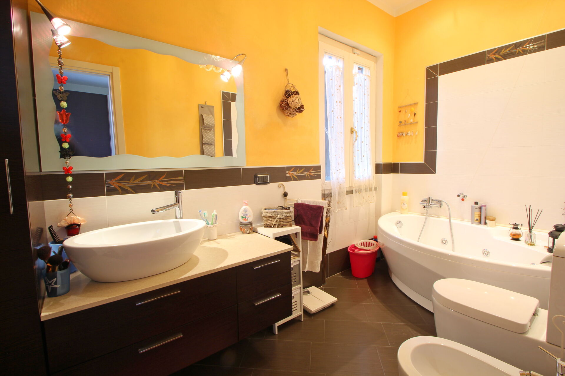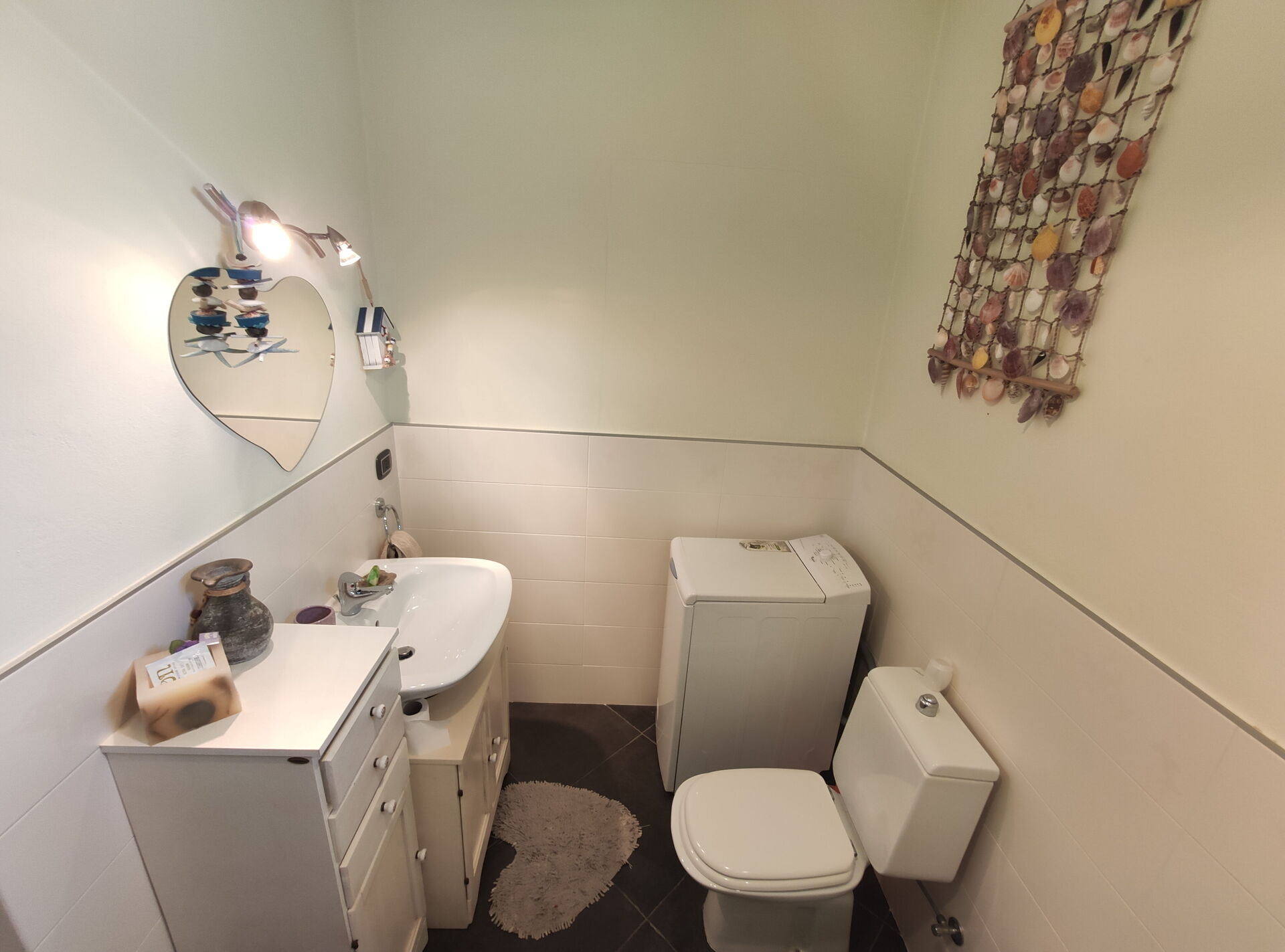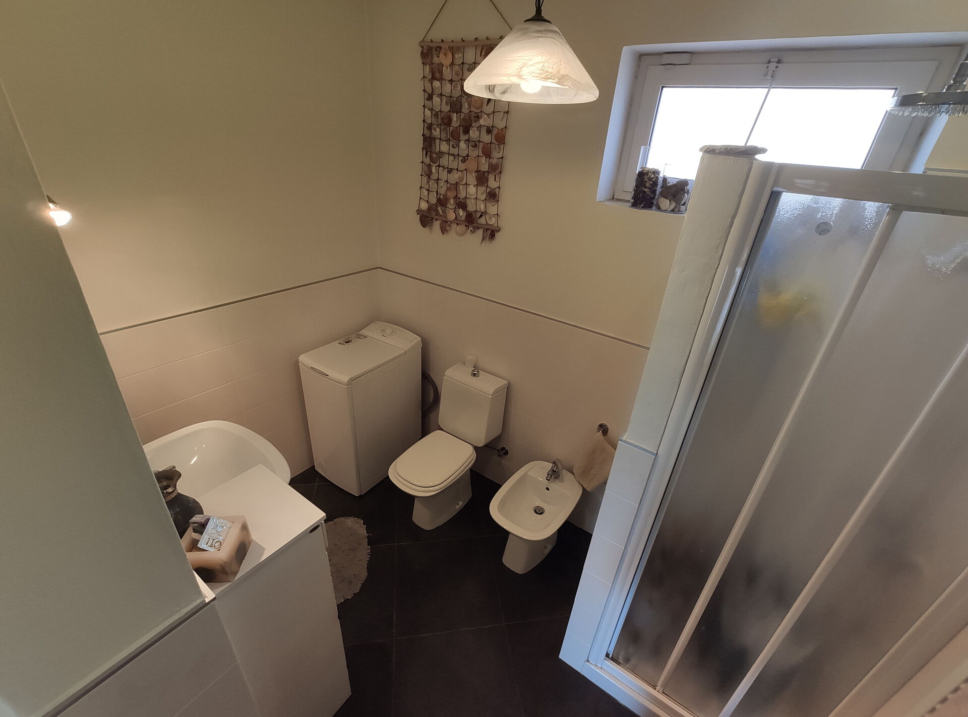 salle de bain: bassin, wc, bidet, douche, lave-linge.