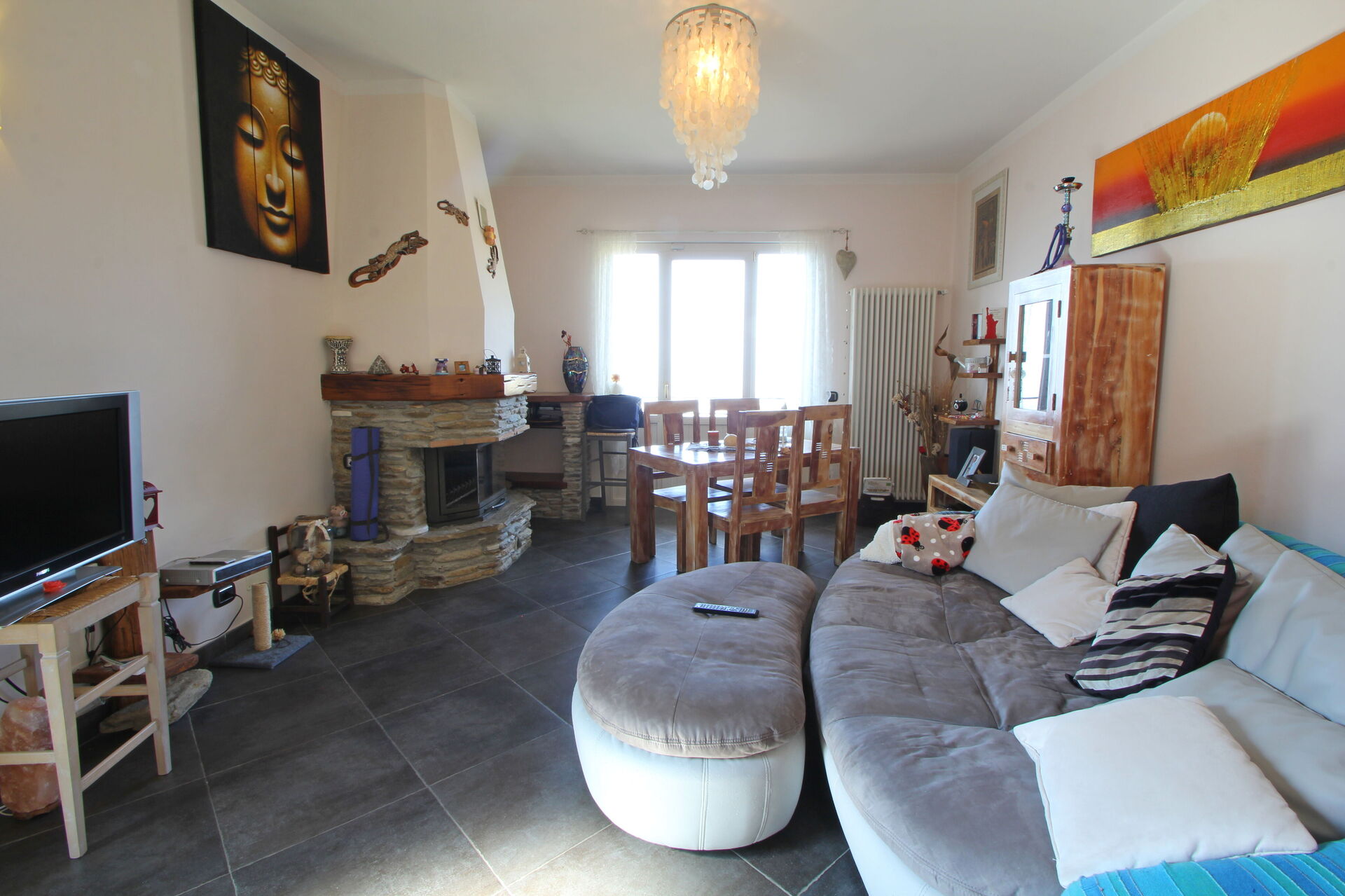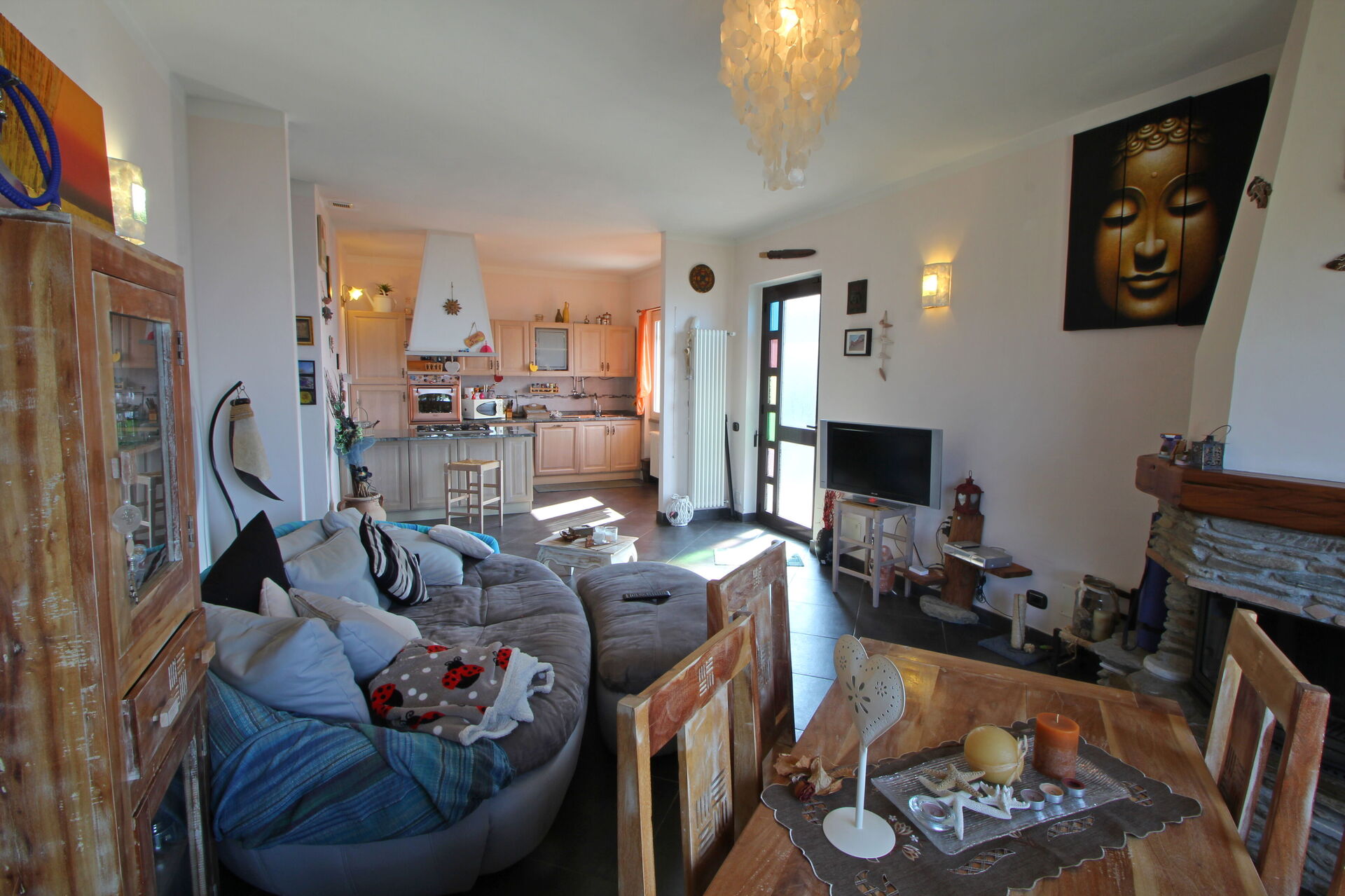 Cuisine – salle de séjour: table à manger (personnes: 6), lave-vaisselle, réfrigérateur, congélateur, cuisinière, four, grille-pain, machine à café italienne, machine à café américaine, canapé, cheminée, internet WIFI, internet, tv satellitaire, télévision, sortie sur le balcon.