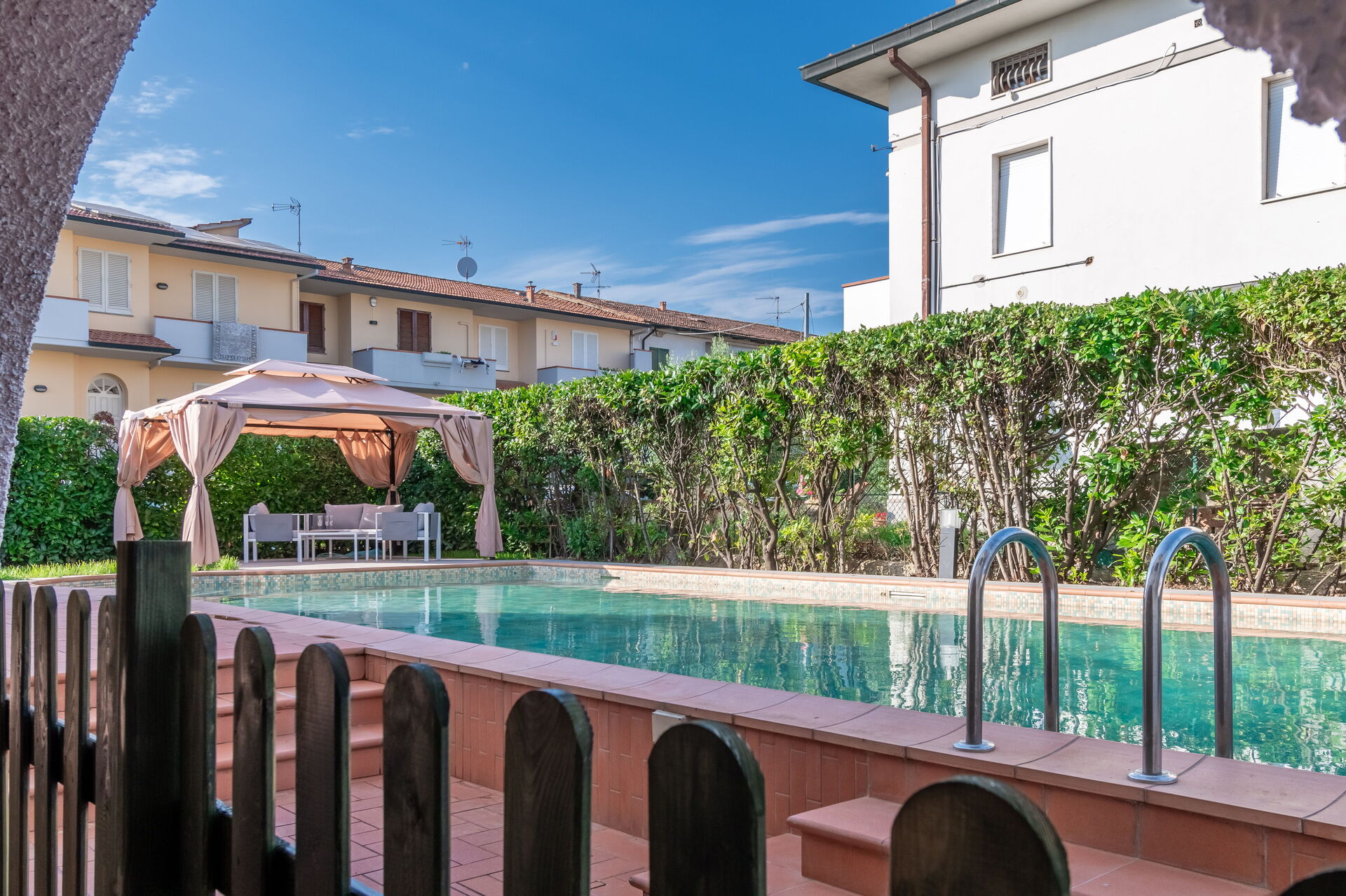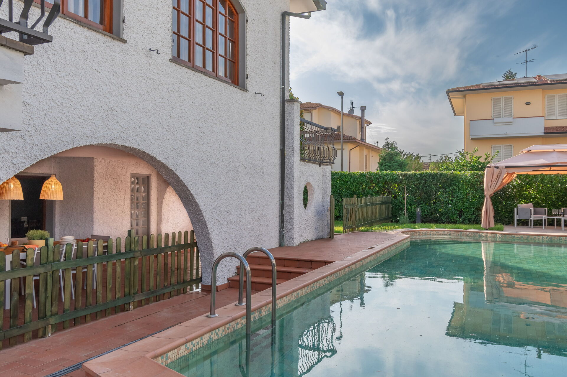 jardin: piscine (privé, largeur: 6m, longueur: 13m, profondeur: 1.5m, profondeur max.: 2m, profondeur min.: 1m), internet WIFI, espace extérieur pour les repas en plein air, table à manger, pavillon, meuble de jardin, chaise longue, clôturé /clôturée, propriété clôturée.