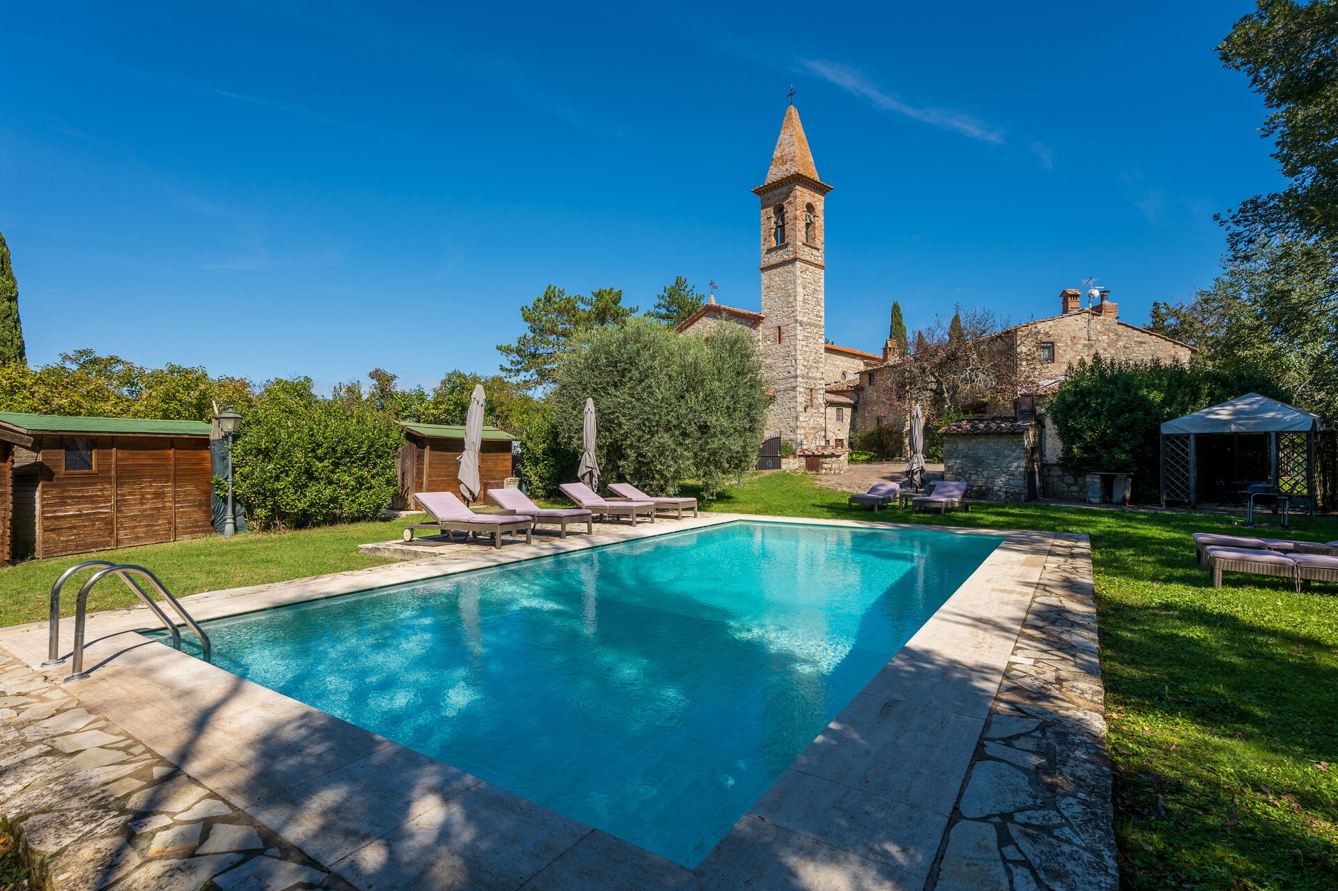 jardin: piscine (privé, en plein air), douche, barbecue, espace extérieur pour les repas en plein air, table à manger, pavillon, meuble de jardin, 12 chaises longues, clôturé /clôturée, propriété clôturée.