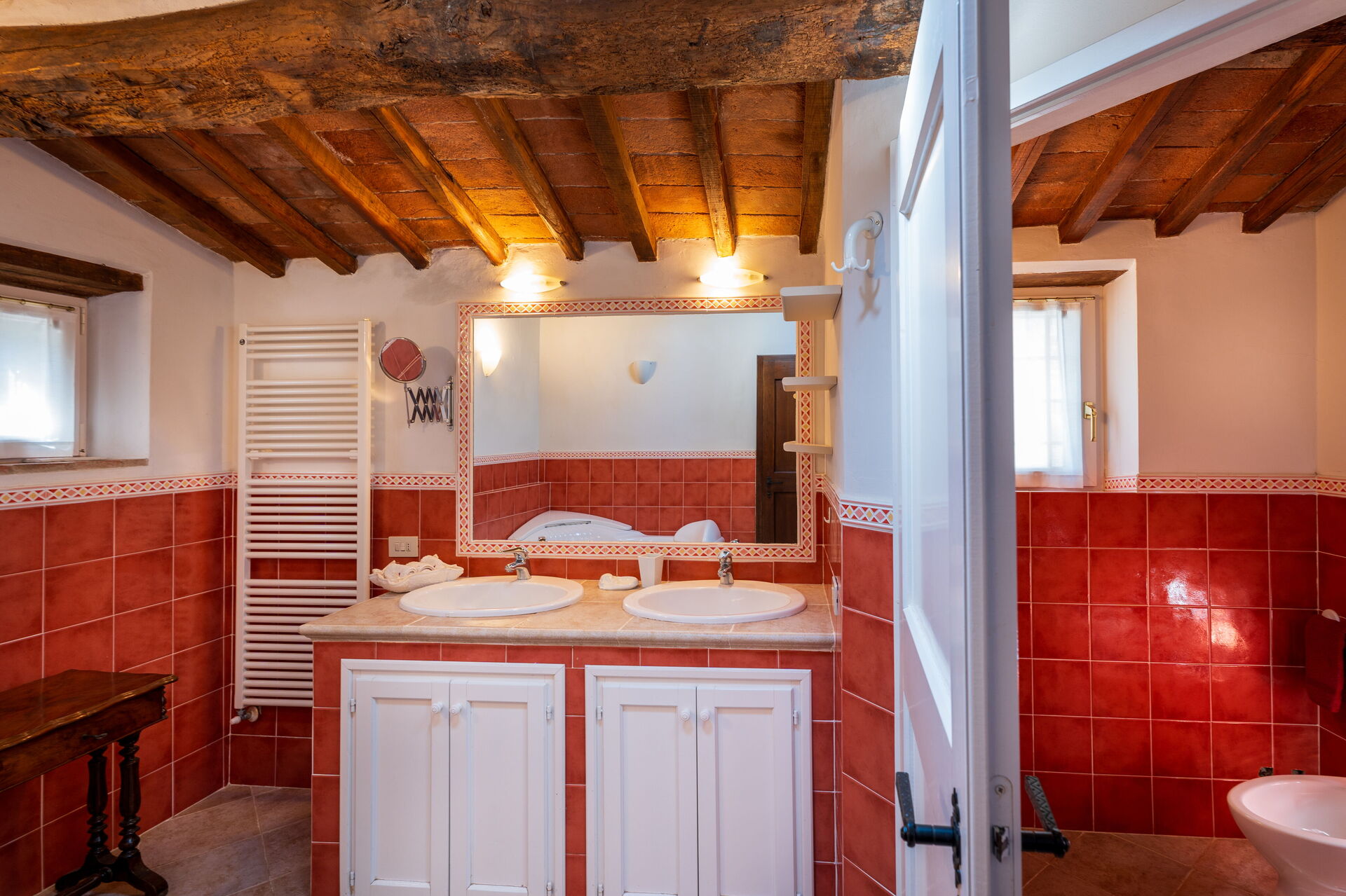 salle de bain: bagnoire à remous, bassin double, wc, bidet, douche.