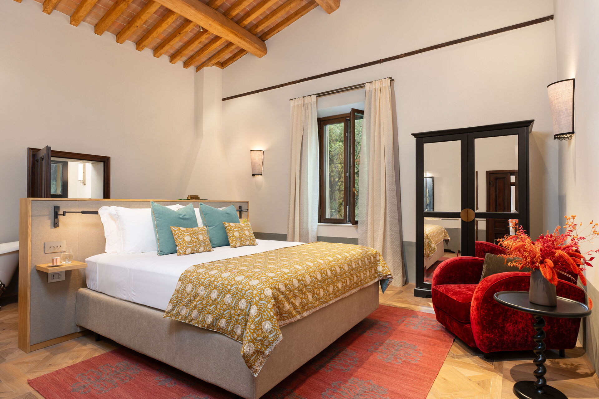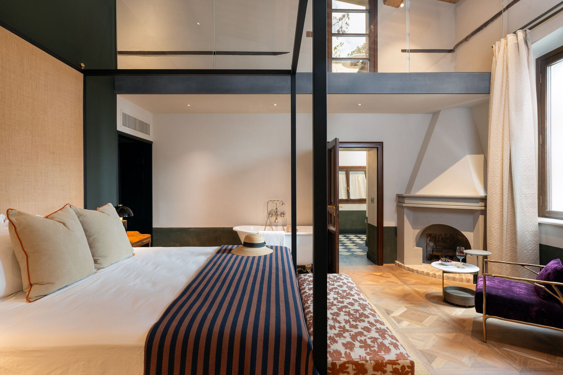 chambre avec salle de bain 1: grand lit à deux places (largeur: 180m, longueur: 200m), internet WIFI, climatisation, bassin, wc, bidet, bagnoire, douche, sèche-cheveux, sortie sur la terrasse, galerie.