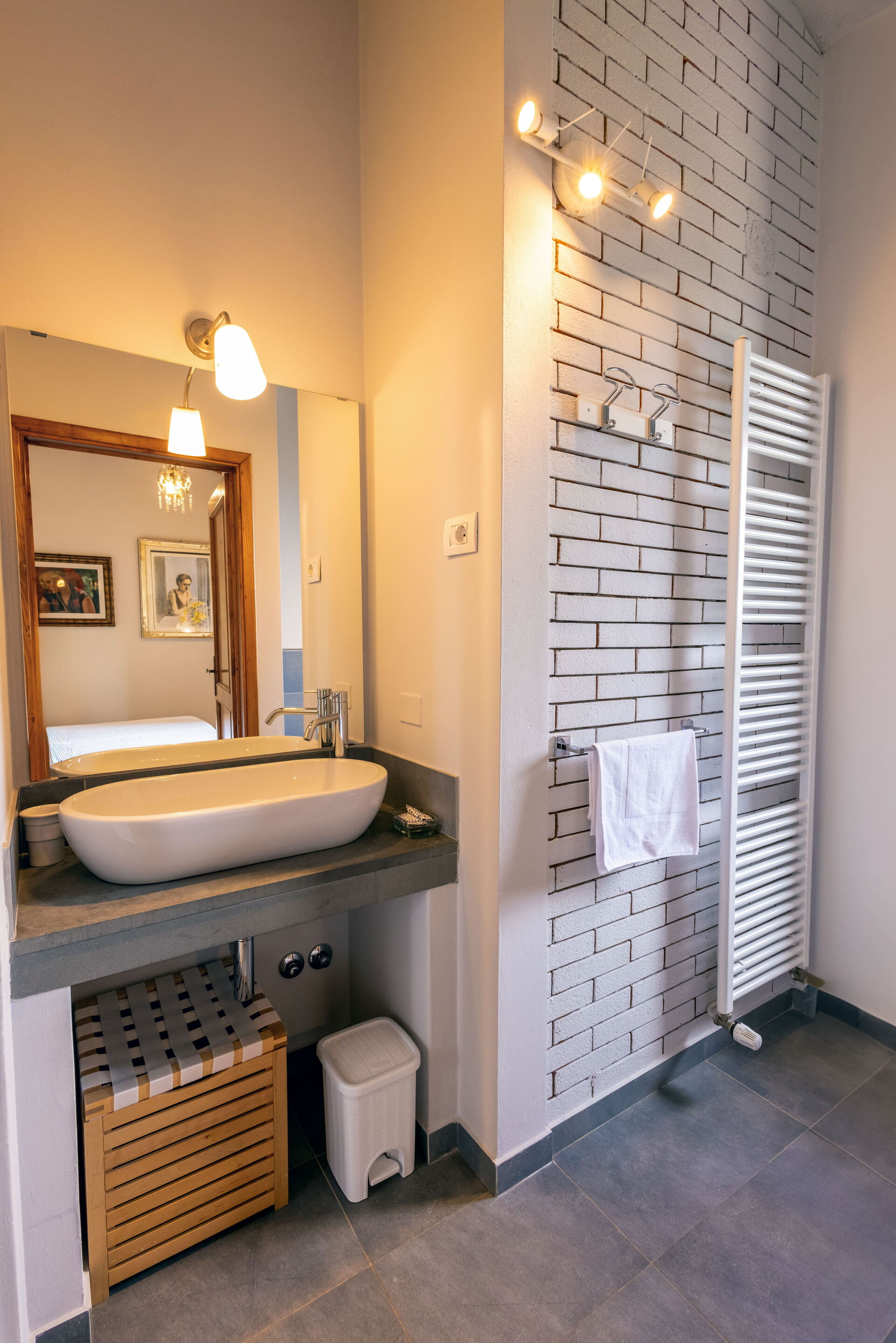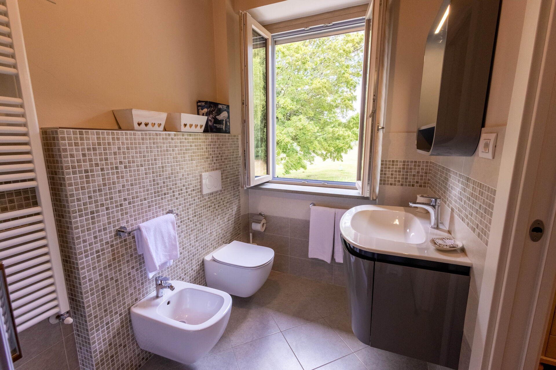 salle de bain: bassin, wc, bidet, douche, sèche-cheveux.