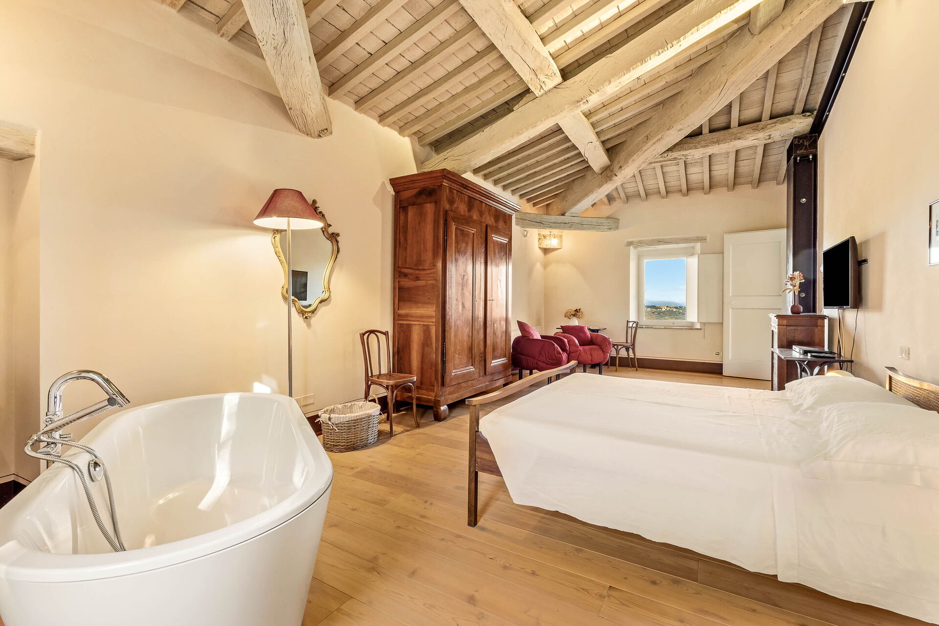 chambre avec salle de bain 1: lit double, lit de bébé, internet WIFI, climatisation, moustiquaires, tv satellitaire, deux fauteuils, bureau, bassin, wc, bidet, bagnoire, douche, sèche-cheveux.
