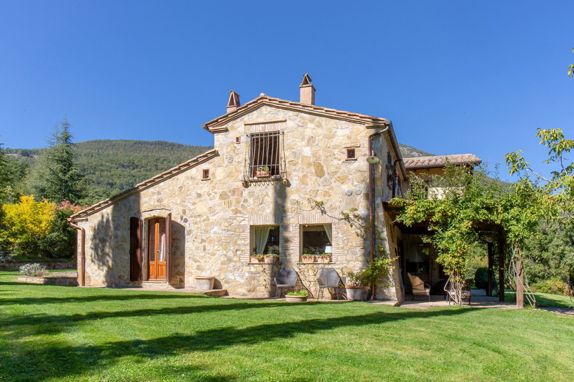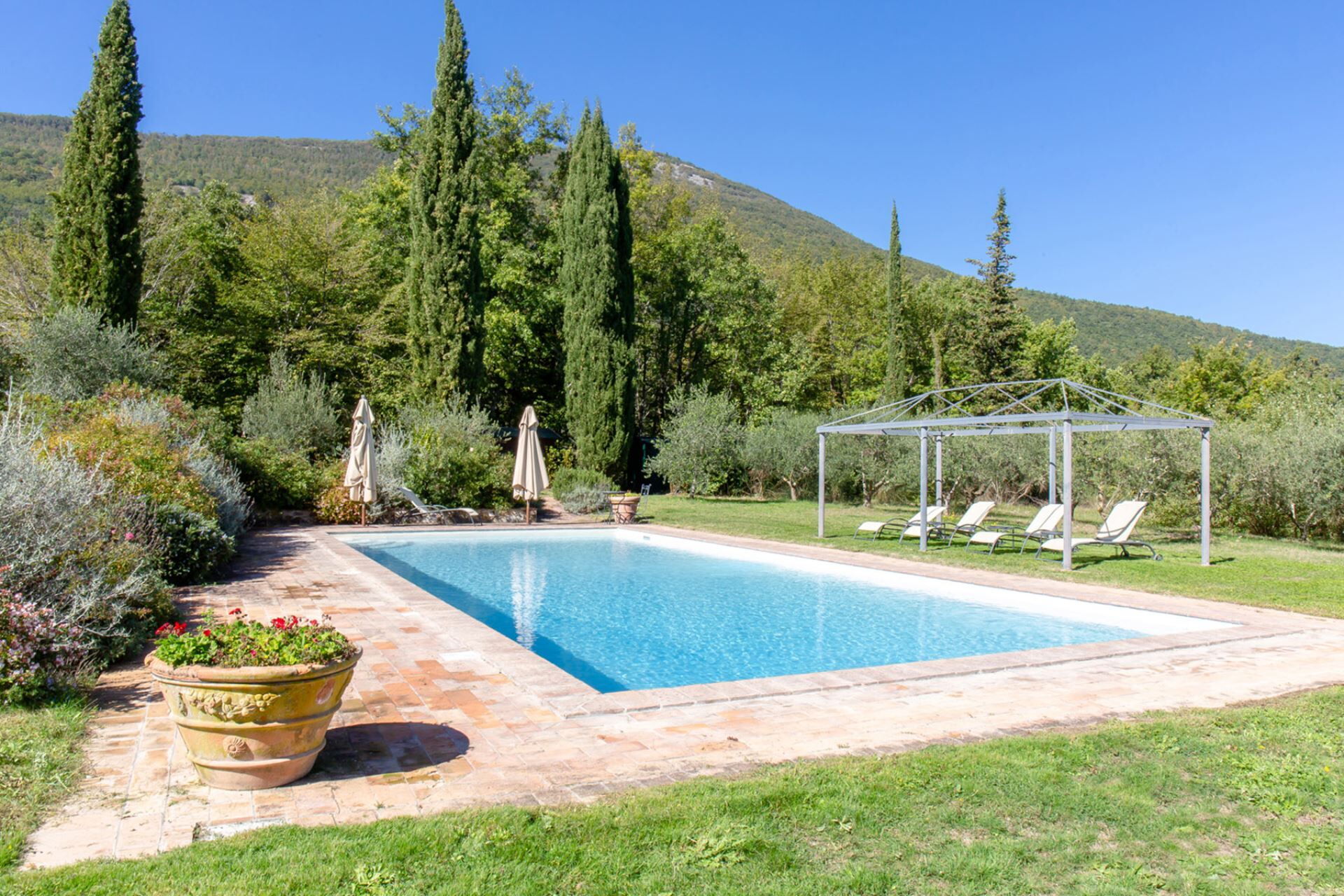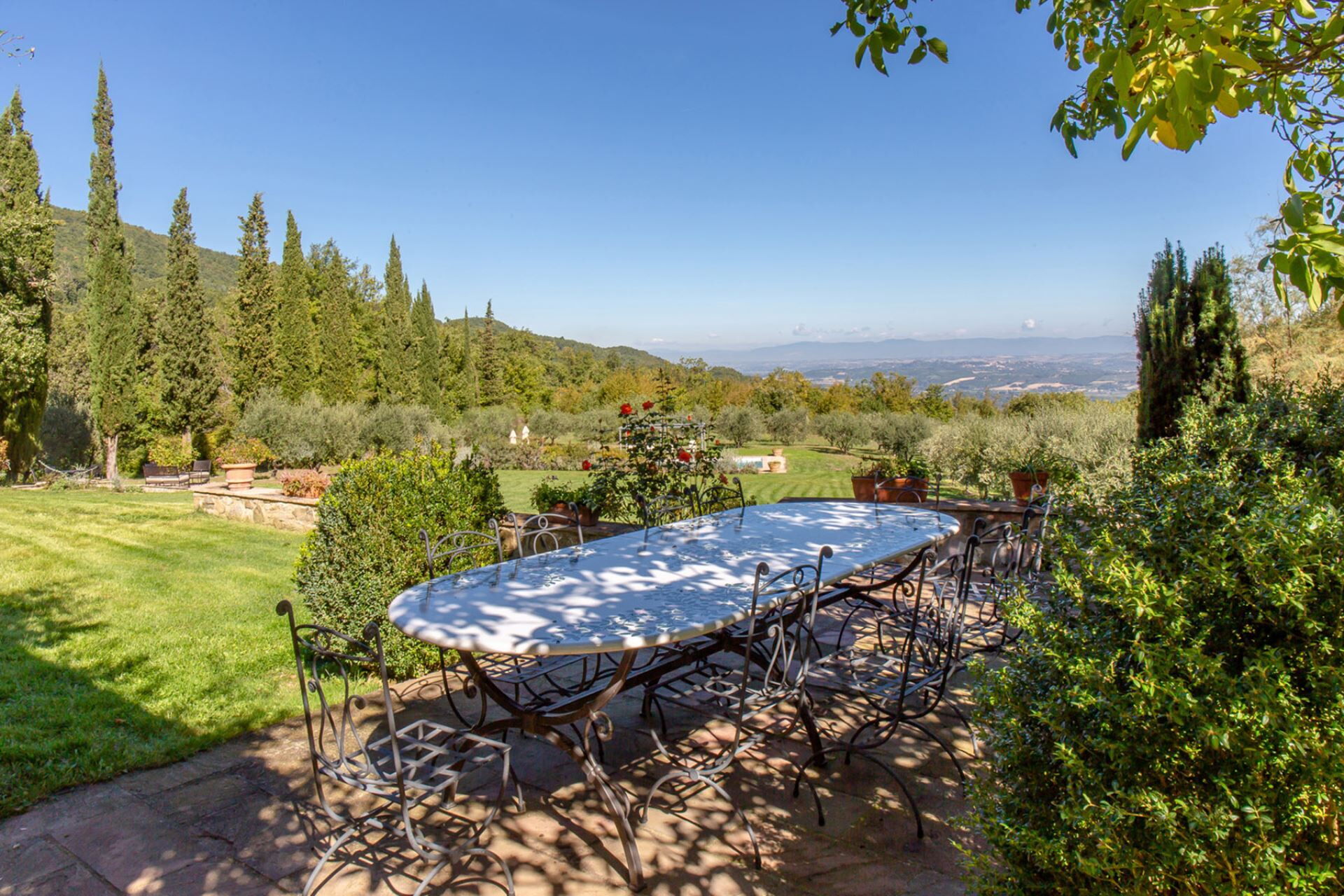 La villa est enveloppée de vastes jardins bordés d'arbustes luxuriants et d'arbres matures, créant une oasis privée de détente. La piscine, située à 80 mètres de la maison principale, est magnifiquement encadrée de rosiers et d'oliviers, offrant un cadre idyllique pour des journées paisibles sous le soleil toscan. Vous disposez d'un accès exclusif à de multiples espaces de réception extérieurs, notamment une grande loggia meublée équipée de canapés et de fauteuils confortables, parfaite pour profiter des douces soirées méditerranéennes. Un spacieux gazebo comprend une table à manger et des chaises conçues pour les repas en plein air, tandis qu'un espace barbecue intégré offre d'excellentes installations pour cuisiner à l'extérieur. La propriété comprend également un terrain de boules pour les activités récréatives et un charmant gazebo près de la piscine pour la détente au bord de l'eau. Un potager biologique est à votre disposition pour profiter de produits frais pendant votre séjour. Le rez-de-chaussée s'ouvre sur une généreuse terrasse meublée qui relie harmonieusement les espaces de vie intérieurs et extérieurs, vous permettant d'embrasser pleinement la beauté du paysage toscan environnant.