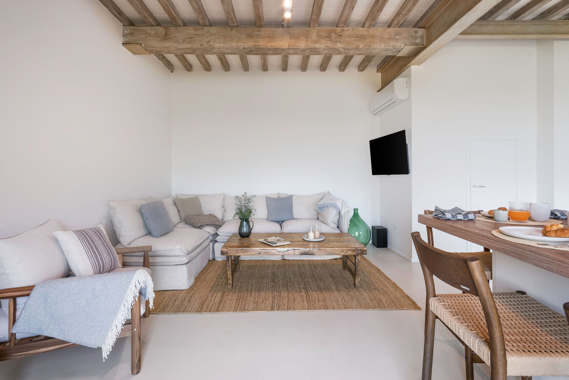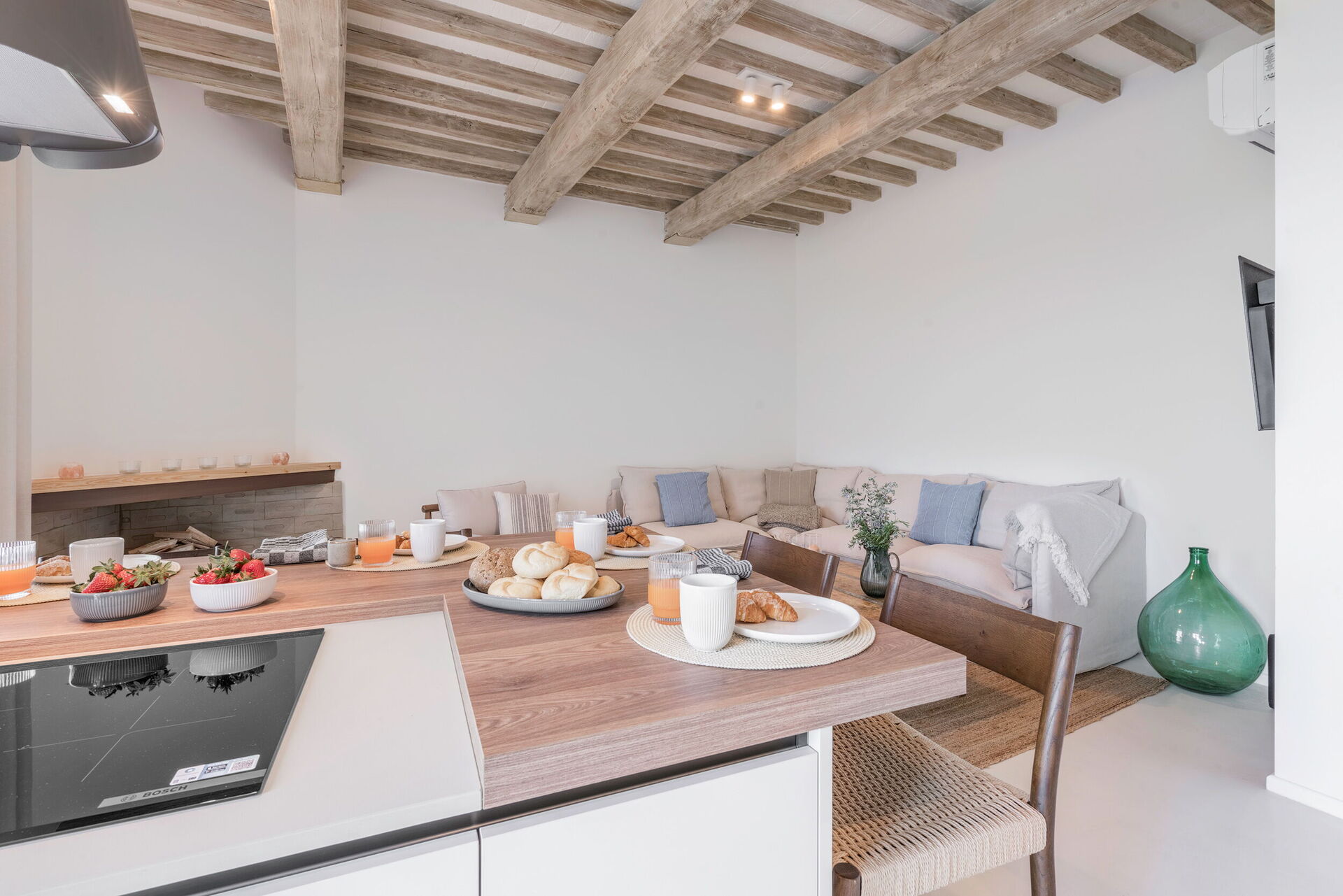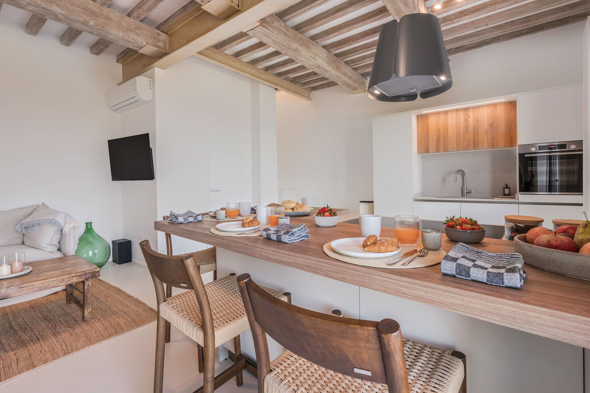 Cuisine – salle de séjour: cuisine bien équipée, table à manger, lave-vaisselle, réfrigérateur, congélateur, four micro-onde, cuisinière, four, machine à café italienne, internet WIFI, climatisation, télévision, sortie sur le jardin.