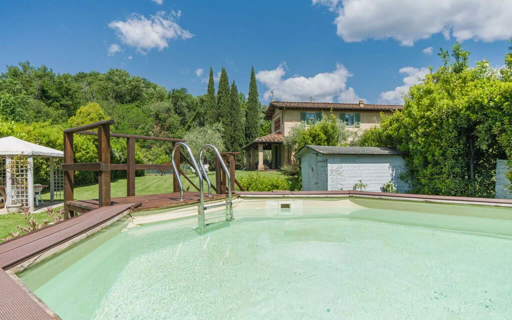 Capezzano à 4 km de Camaiore: Belle maison individuelle moderne "Il Casale", environnée par les prés. À 500 m du centre de Capezzano, à 5 km du centre de Lido di Camaiore, à 20 km du centre de Lucca, situation centrale, ensoleillée, à 5 km de la mer, à 5 km de la plage, dans une impasse, dans une rue, dans la verdure. A usage privé: jardin 1'500 m2 (clôturé) avec pelouse, piscine (hors sol) (6 x 3 m, profondeur 100 cm, disponibilité saisonnière: 01.Mai. - 04.Oct.). Douche extérieure, jardinet, meubles de jardin, barbecue, place de parking (pour 5 voitures) sur le terrain. Magasin d'alimentation 500 m, supermarché 1 km, restaurant 1 km, bar 1 km, arrêt de bus 500 m, gare ferroviaire "Viareggio" 6 km, plage de sable 5 km. Attractions à proximité: Camaiore 5 km, Forte dei Marmi 11 km, Pietrasanta 5 km, Marina di Pietrasanta 9 km, Pisa 46 km, Carrara cave Fantiscritti 44 km. Les lacs connus sont facilement accessibles: Torre del Lago 22 km, Lago di Massaciuccoli 16 km. Région de randonnées: Antro del Corchia Levigliani 32 km. Veuillez noter: voiture recommandée. Le propriétaire n'accepte pas les groupes de jeunes.