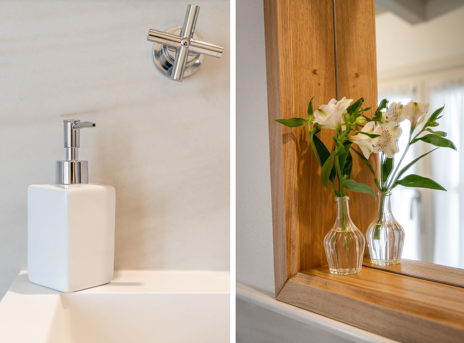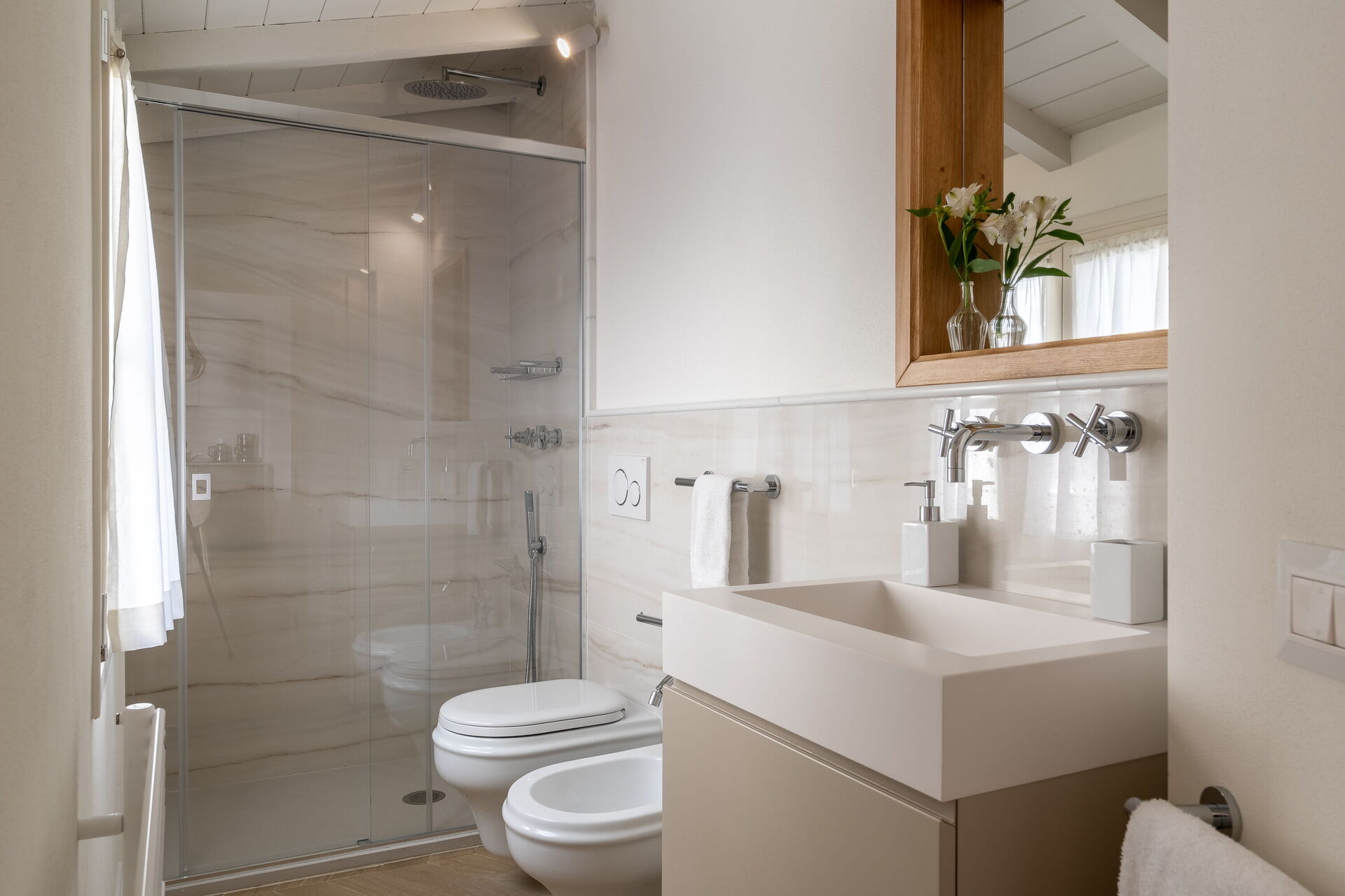 salle de bain: bassin, wc, bidet, douche, sèche-cheveux.