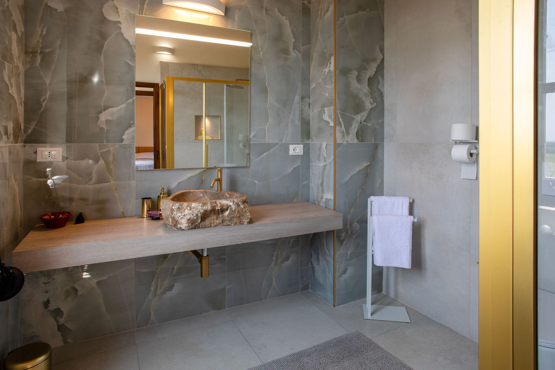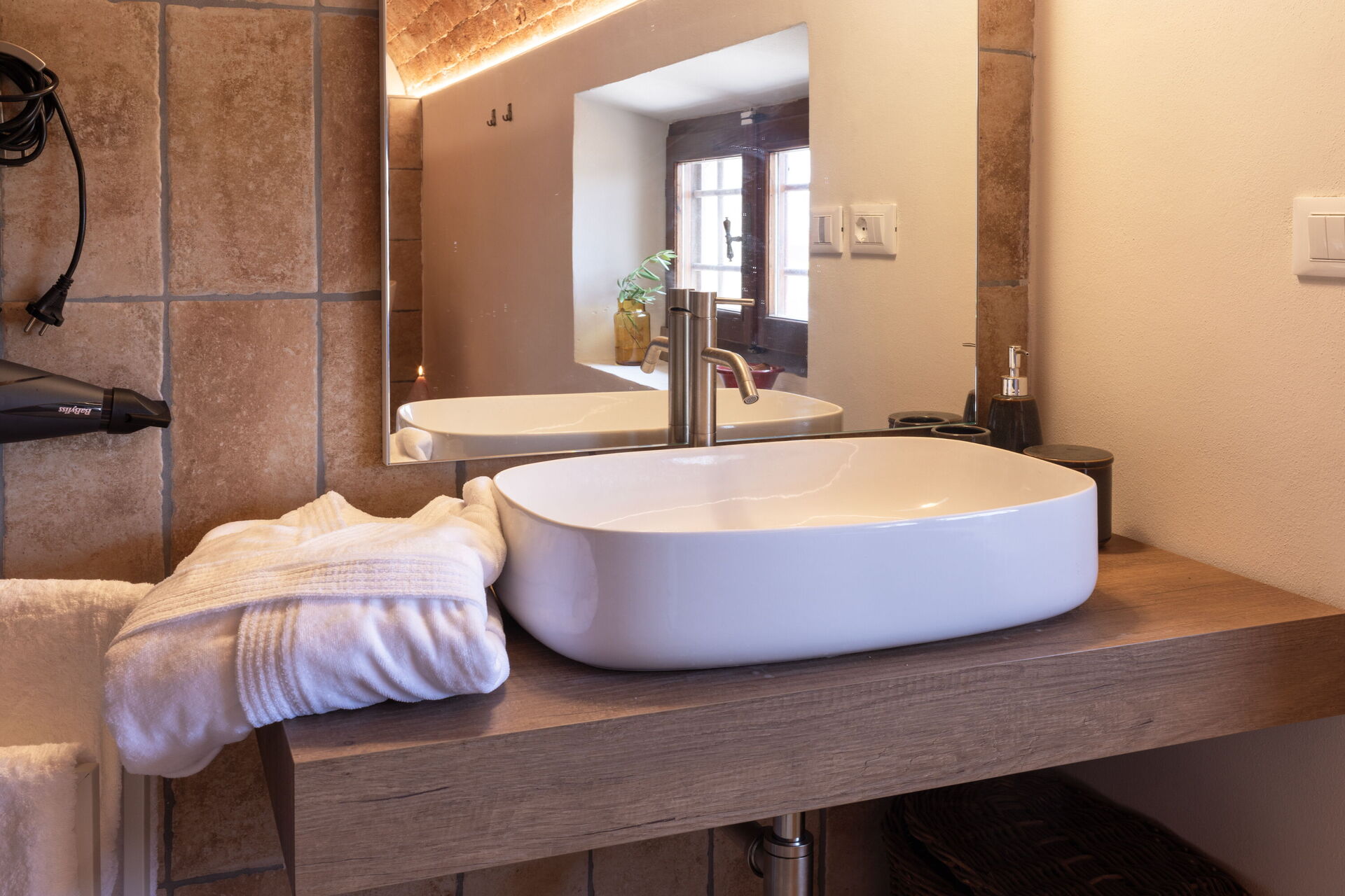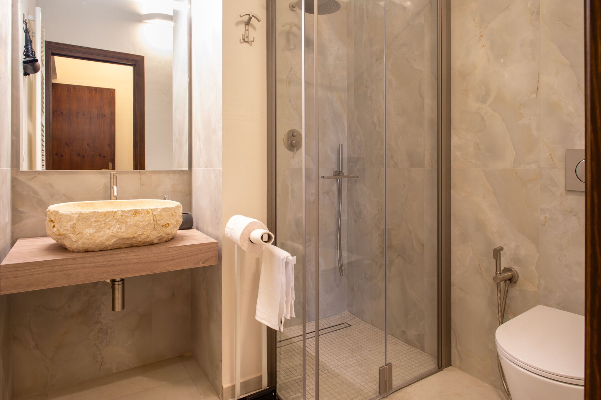chambre avec salle de bain 2 (50 m2): grand lit à deux places (largeur: 1.8m, longueur: 2.1m), internet WIFI, climatisation, fauteuil, bureau, wc, douche, sèche-cheveux.