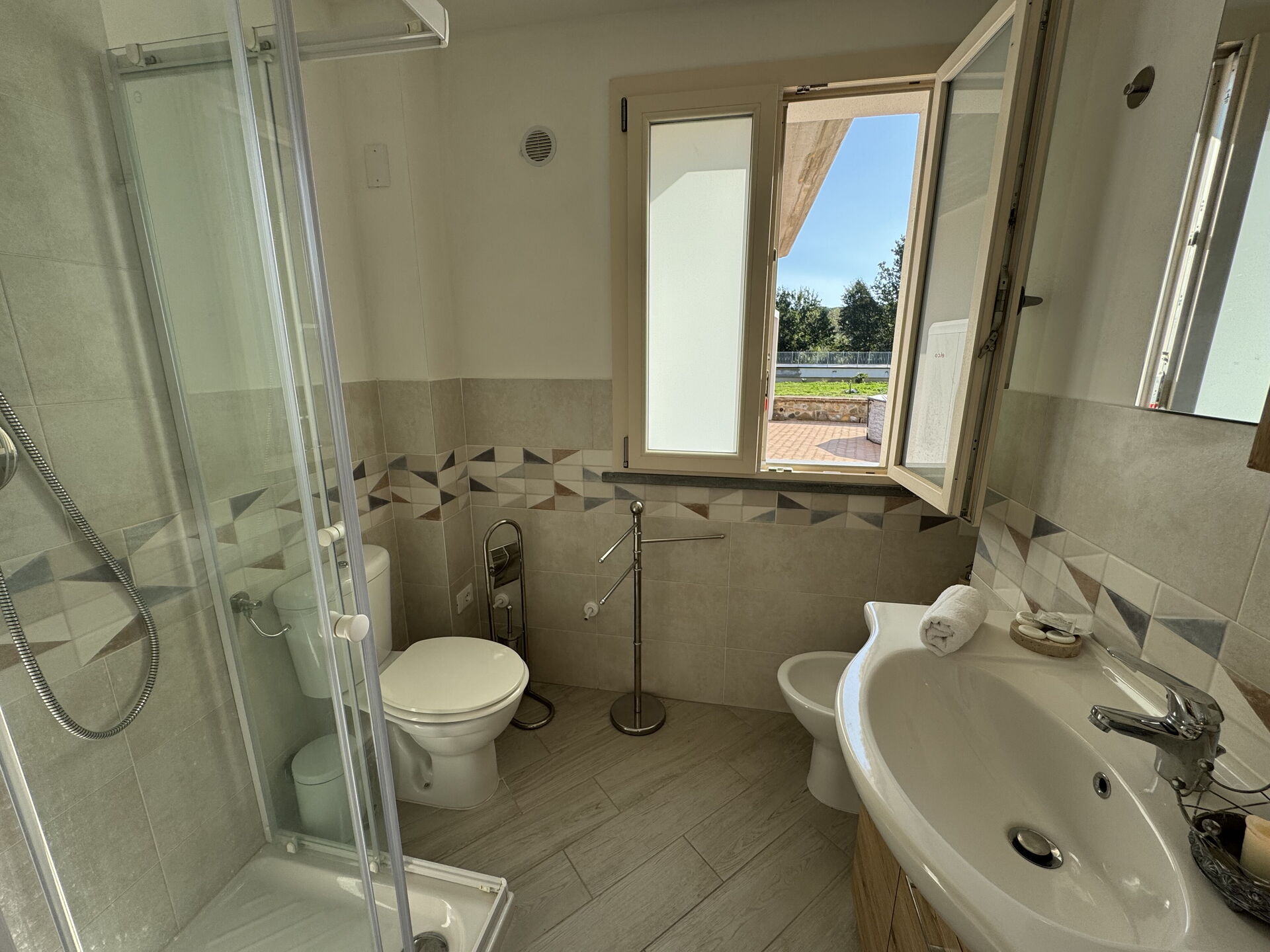 salle de bain: bassin, wc, bidet, douche, sèche-cheveux.