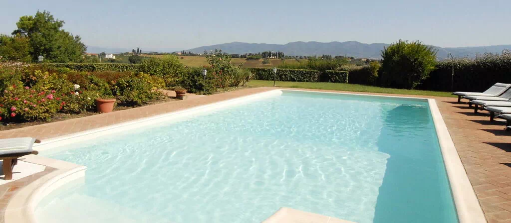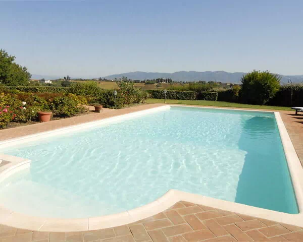 La piscine privée constitue le cœur des espaces extérieurs de Villa Michelangelo, positionnée de manière à permettre de profiter des vues étendues de la campagne. La cour environnante s'étend généreusement sur le flanc de la colline, offrant des espaces ouverts où la beauté naturelle des oliviers et des jardins fleuris devient partie intégrante de l'expérience quotidienne.