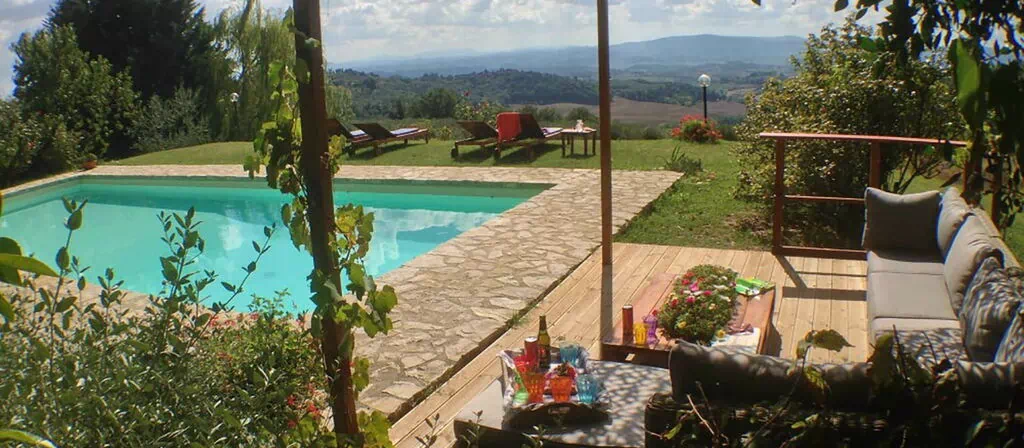 Le grand jardin privé comprend une piscine de 5 par 10 mètres équipée de transats et de parasols. Un patio couvert offre un espace ombragé, tandis que plusieurs zones de détente aménagées avec tables et chaises sont disposées dans le jardin pour profiter des vues panoramiques qui s'étendent jusqu'à San Gimignano. Une loggia couverte est aménagée pour les repas en plein air ; un barbecue est également à la disposition des hôtes. Une pergola complète la variété des espaces extérieurs.