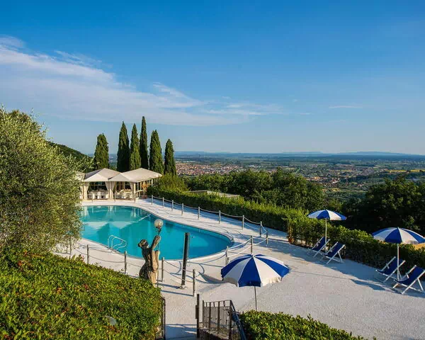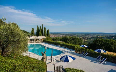 La piscine privée peut être chauffée sur demande et est équipée de transats et de parasols. Un gazebo couvert offre un espace sophistiqué et polyvalent, idéal pour accueillir des événements ou profiter d'une retraite ombragée avec vue sur la vallée environnante. Le jardin se développe gracieusement sur plusieurs terrasses, chacune dotée de fontaines et de coins aménagés. Ces terrasses offrent des vues sur les couchers de soleil de la région.