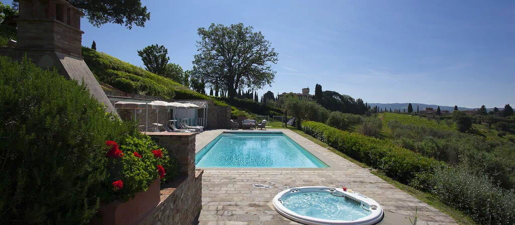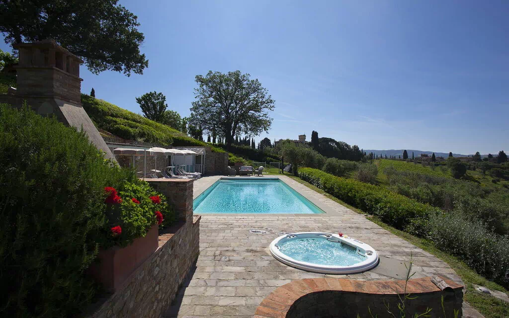 Les espaces extérieurs de Villa Chianti s'articulent autour d'un jardin parfaitement entretenu qui entoure la propriété, offrant des espaces verts luxuriants et des aménagements paysagers soignés. La piscine privée est implantée dans l'une des zones les plus panoramiques du domaine, accompagnée d'un jacuzzi positionné à proximité ; des transats et des parasols sont disposés autour de la zone de baignade. Un patio couvert aménagé d'une table et de chaises jouxte la piscine et permet les repas en plein air, tandis qu'un barbecue en pierre complète les équipements extérieurs. L'ensemble de la zone extérieure est délimité par une clôture privée.