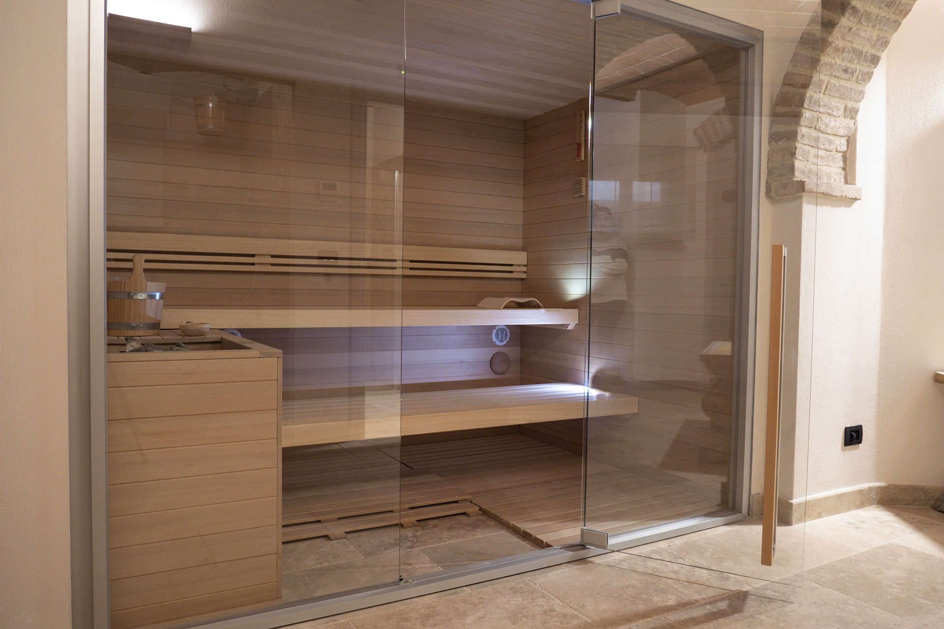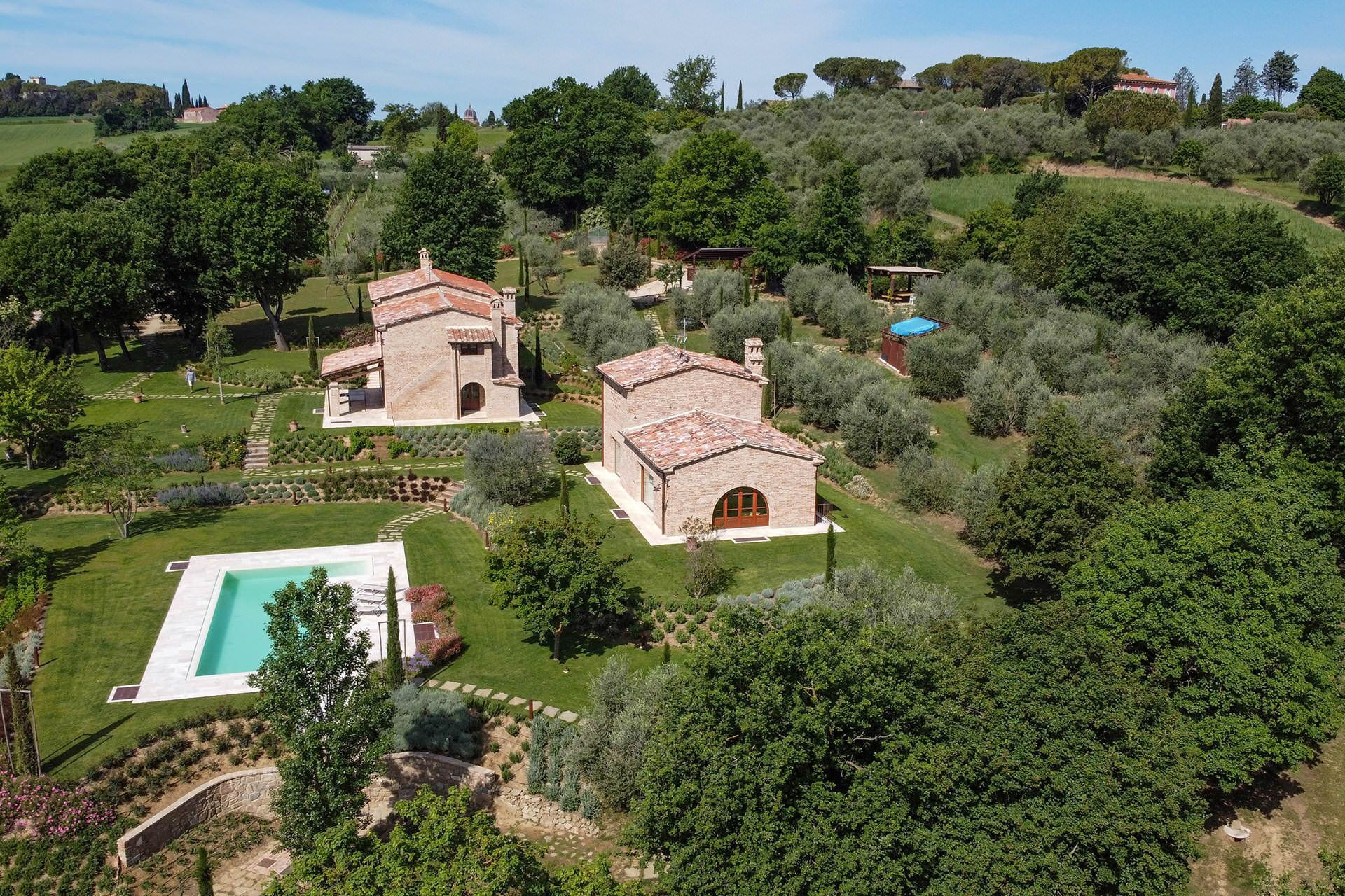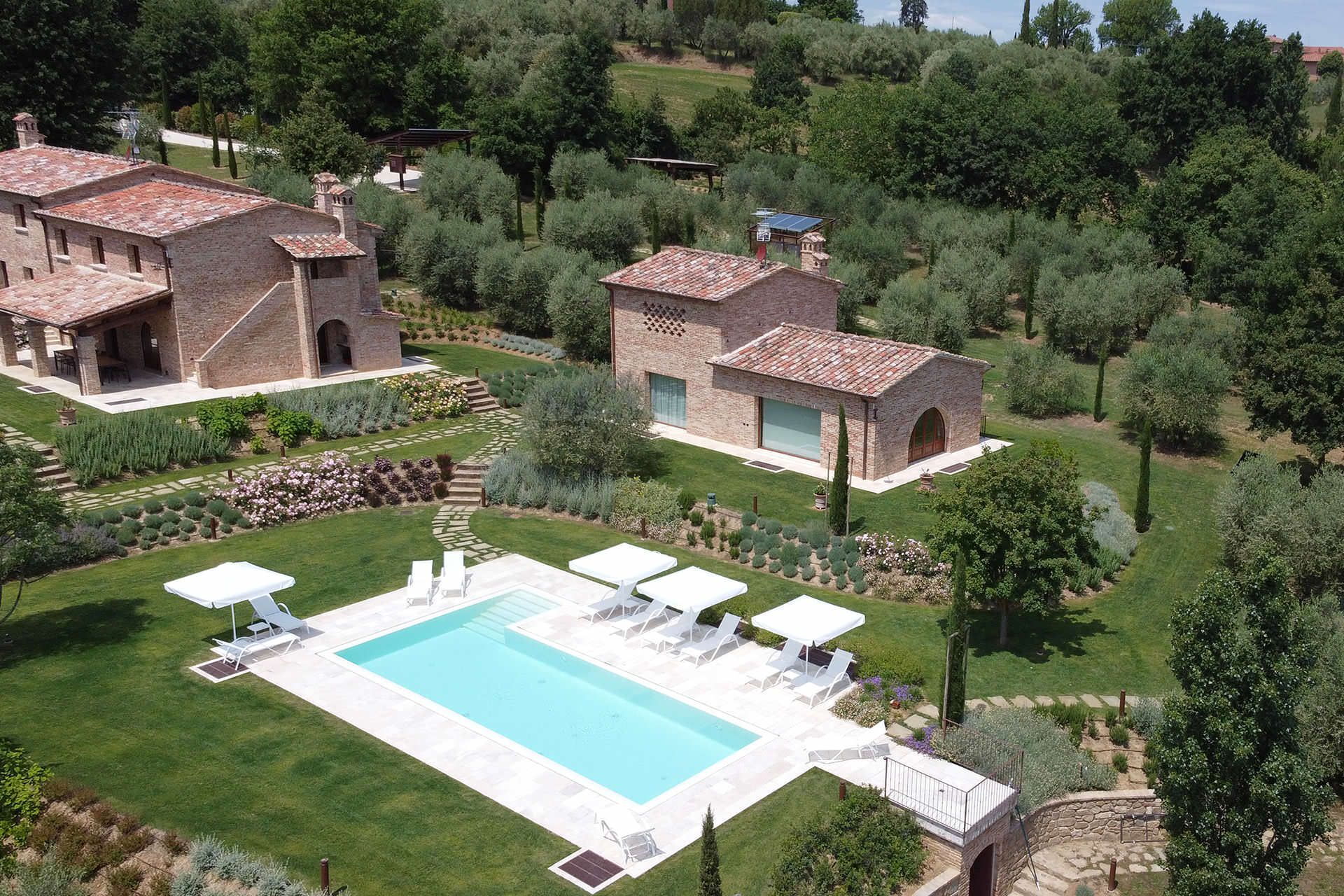 Le rez-de-chaussée comprend un grand séjour avec des canapés élégants, une salle à manger, une cuisine entièrement équipée et 1 salle de bains complète. Le premier étage accueille 5 chambres doubles, chacune dotée de sa propre salle de bains avec douche et d'un minibar ; 1 chambre peut être convertie en lits jumeaux sur demande, et 2 chambres peuvent chacune accueillir un lit simple supplémentaire. Toutes les chambres offrent une vue sur le parc. Le sous-sol comprend une deuxième cuisine, un vaste espace ouvert pour des activités telles que les dégustations de vin et les cours de cuisine, une cave remplie de vins toscans fins incluant Montalcino, Montepulciano et Chianti, un séjour avec canapés et une table de billard. Le sous-sol abrite également le spa, doté d'une baignoire jacuzzi, de salons de relaxation, d'un sauna, d'un hammam, d'une douche émotionnelle et de vestiaires et salles de massage. La dépendance propose un rez-de-chaussée avec cuisine, un séjour avec un canapé-lit double, et un premier étage avec une chambre double, une salle de bains privée et un dressing.