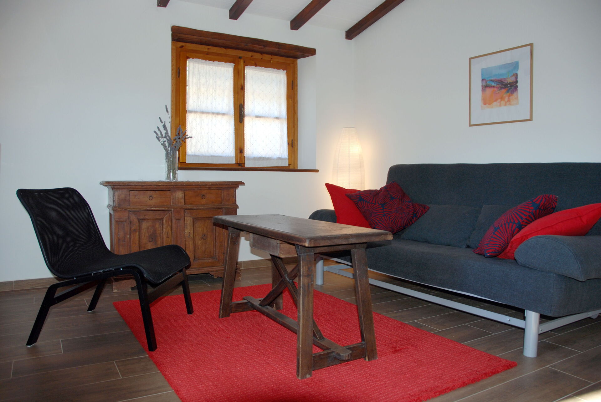 Salon (16.3 m2): deux fauteuils, bureau, poêle à bois, canapé-lit double (largeur: 1.3m, longueur: 2m), internet WIFI, climatisation, moustiquaires.