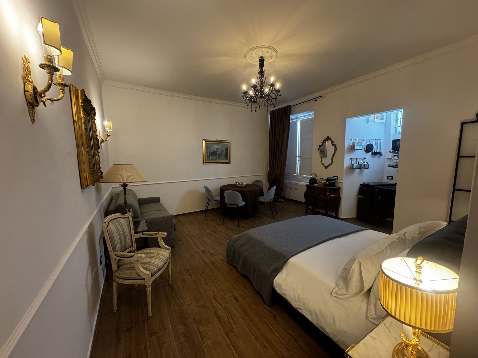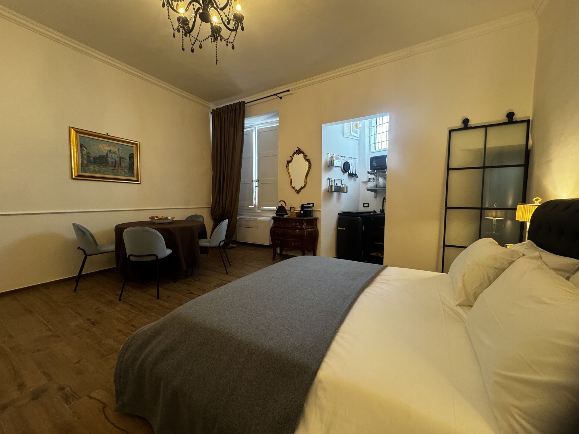 espace ouvert: table à manger, lit double, canapé-lit double, internet WIFI, climatisation, réfrigérateur, cuisinière, congélateur, fer à repasser, cuisine bien équipée, four micro-onde, machine à café italienne.