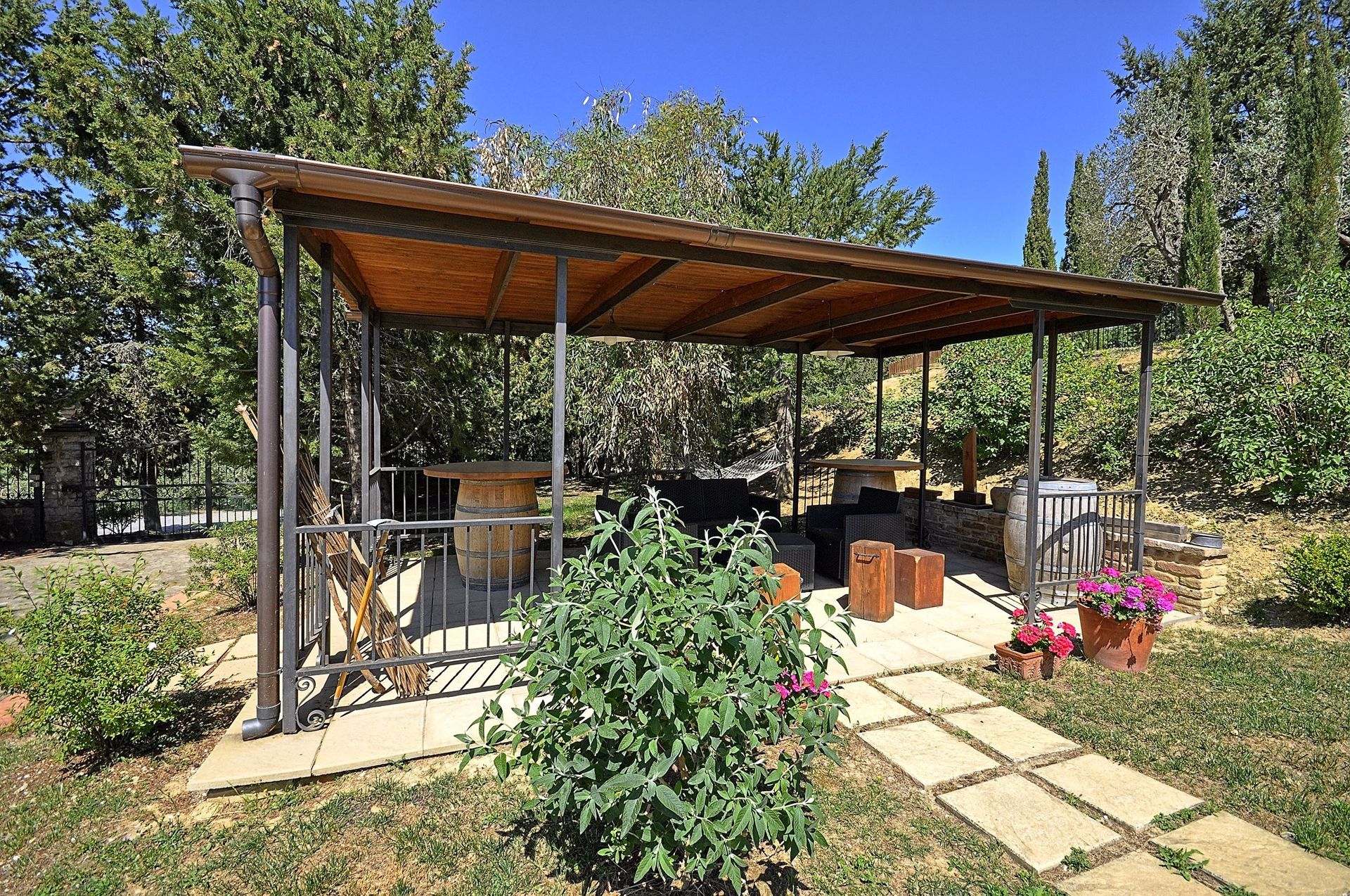 Du rez-de-chaussée on accède à un espace extérieure équipé avec pavillon, table, chaises et barbecue.
