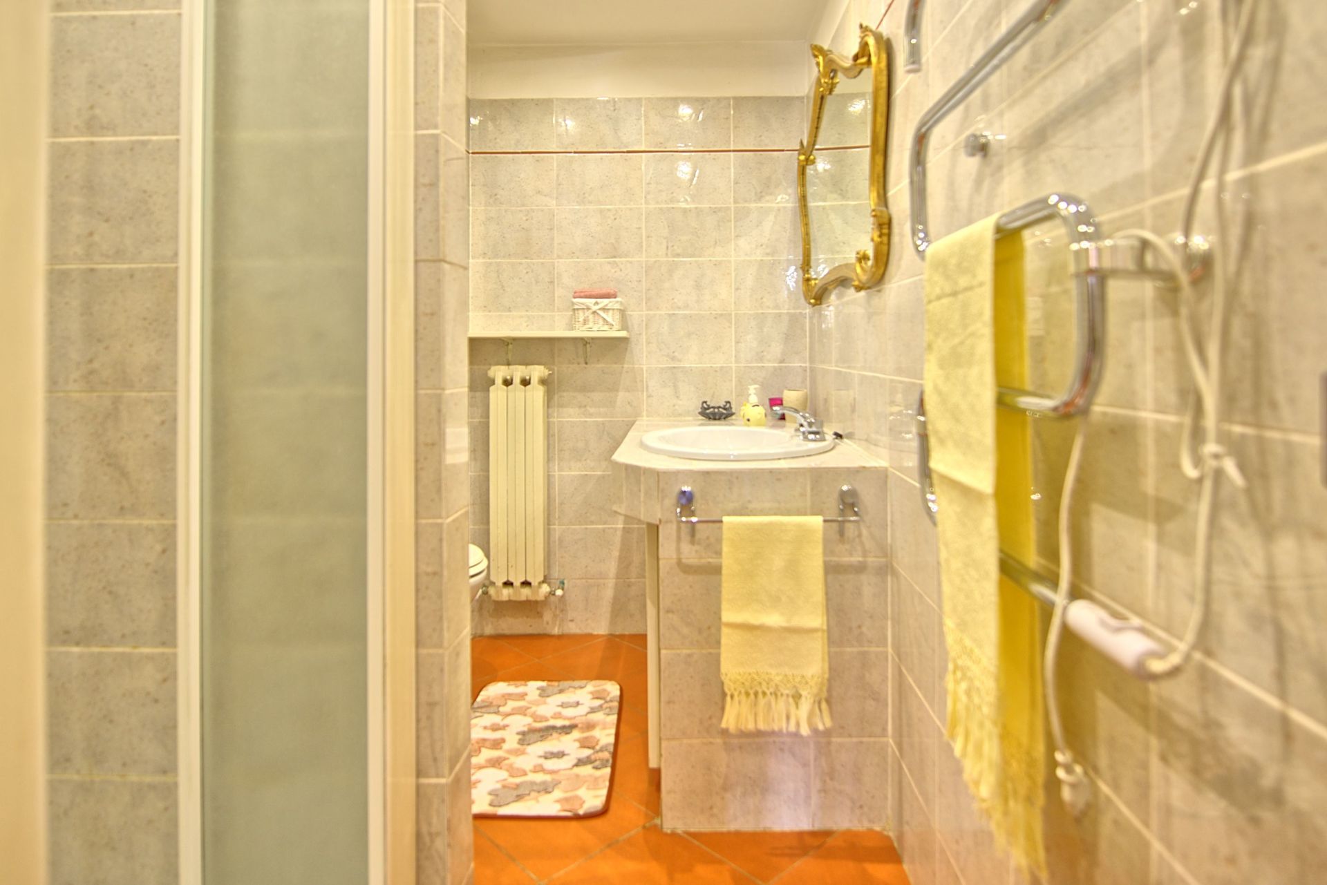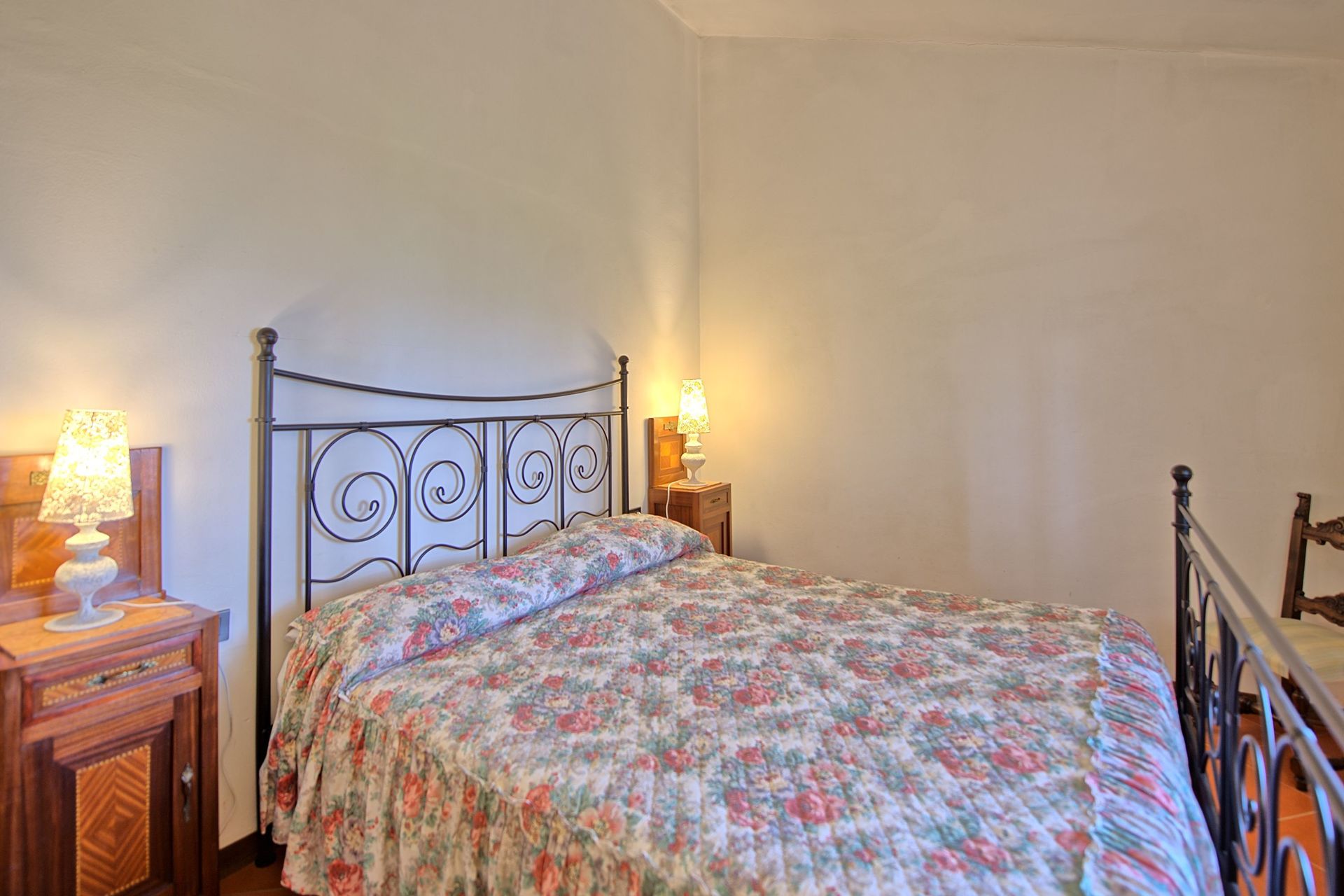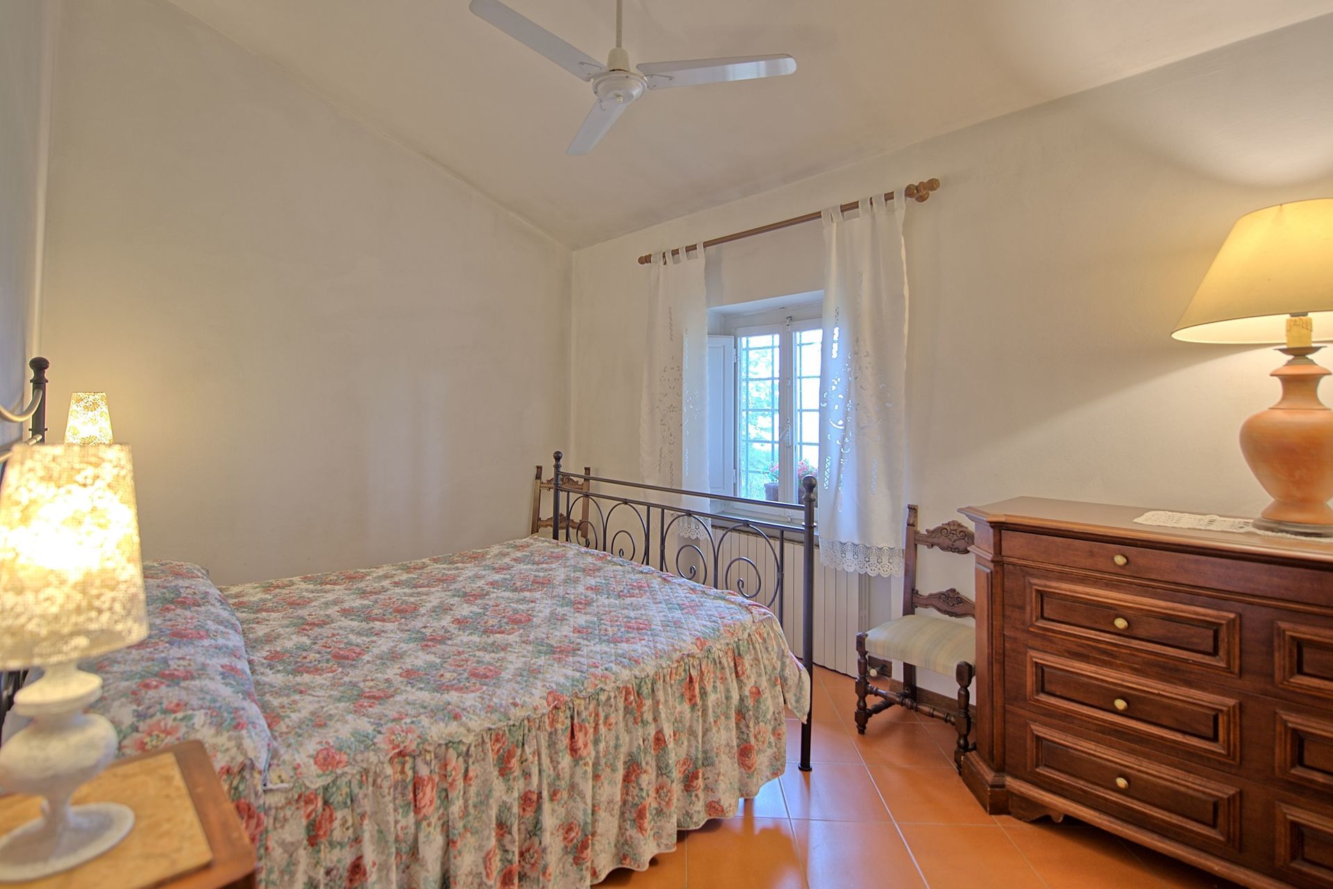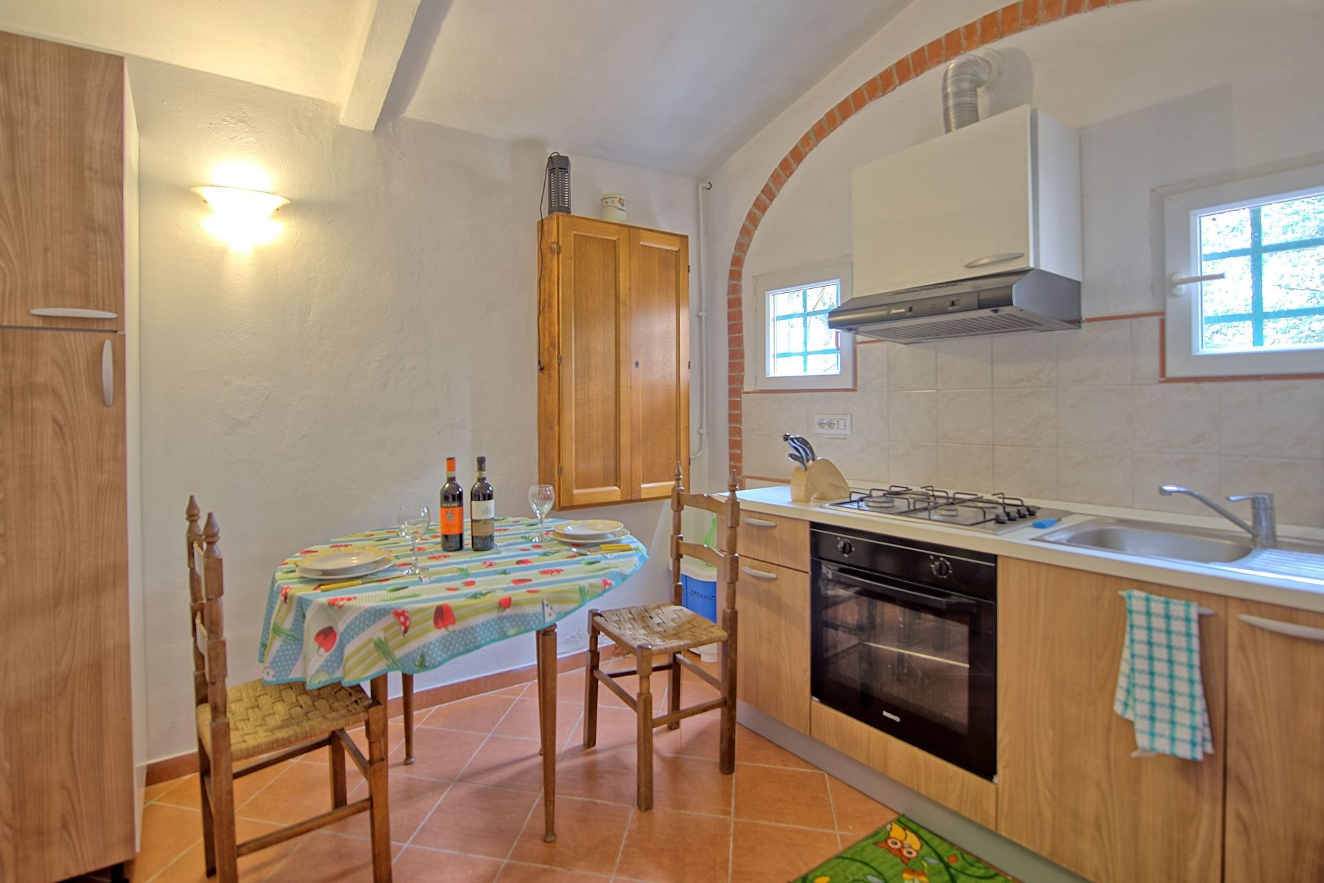 Rez-de-chaussée: cuisine (four, freezer), une chambre double avec ventilateur au plafond, salle de bains avec douche et lave-linge (sans fenêtre).