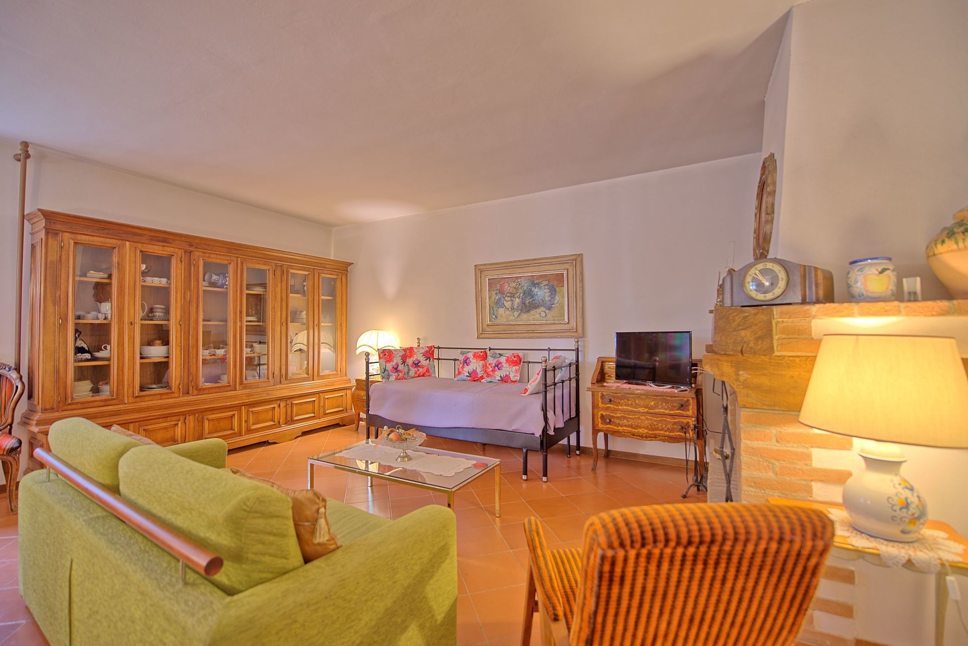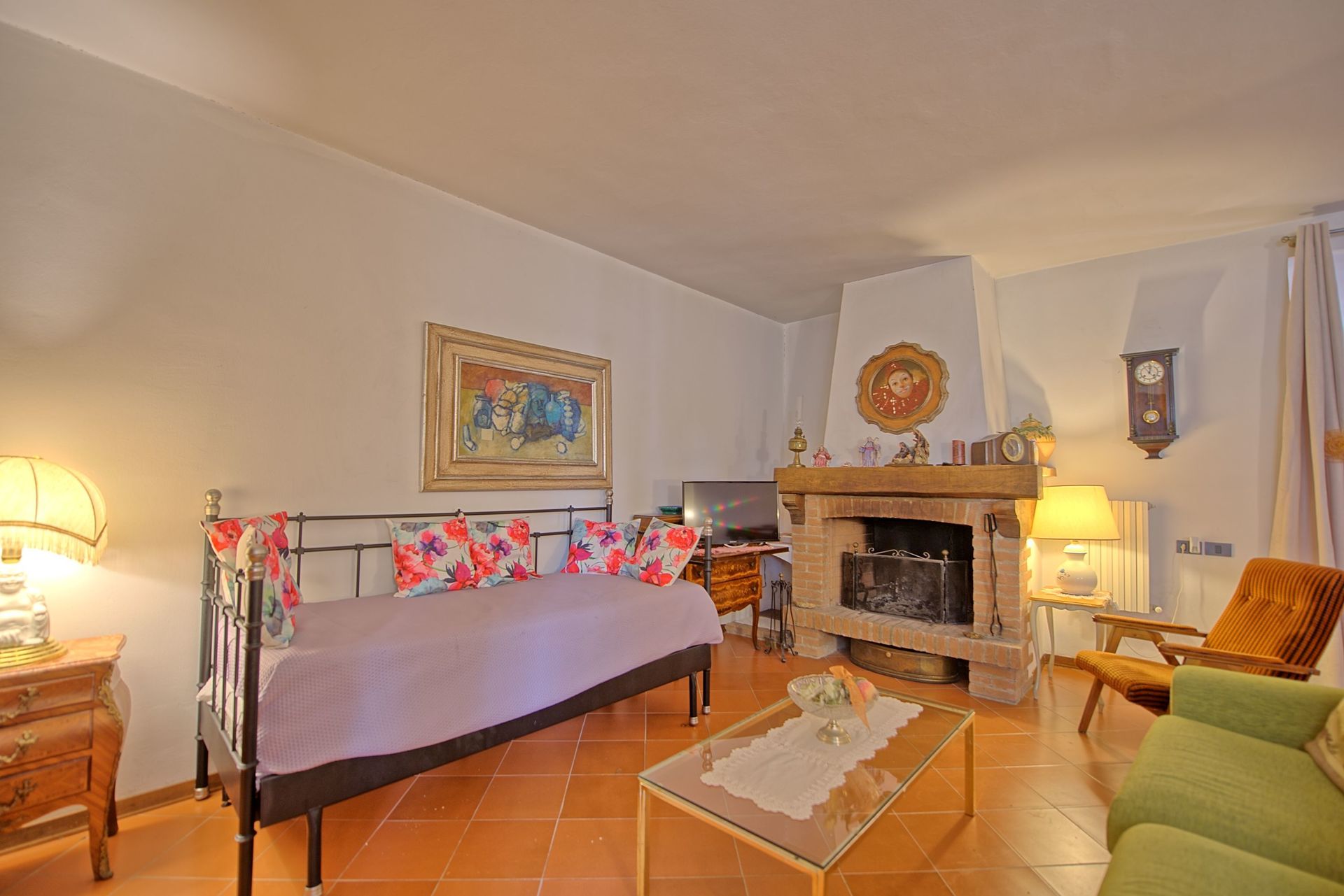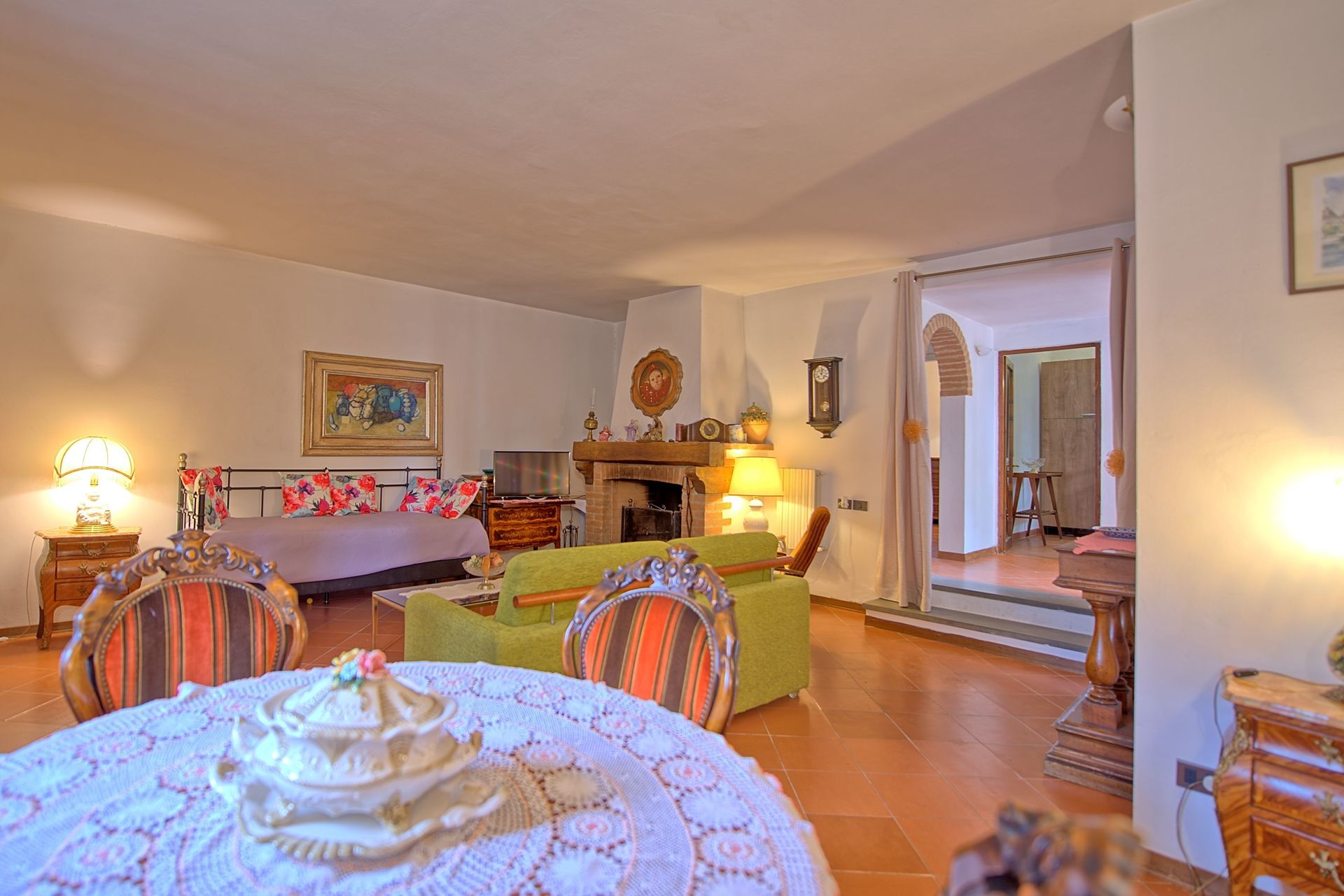2 marches plus haut: grand séjour (TV-Sat) avec table pour les repas, 2 lits à une place et cheminée.