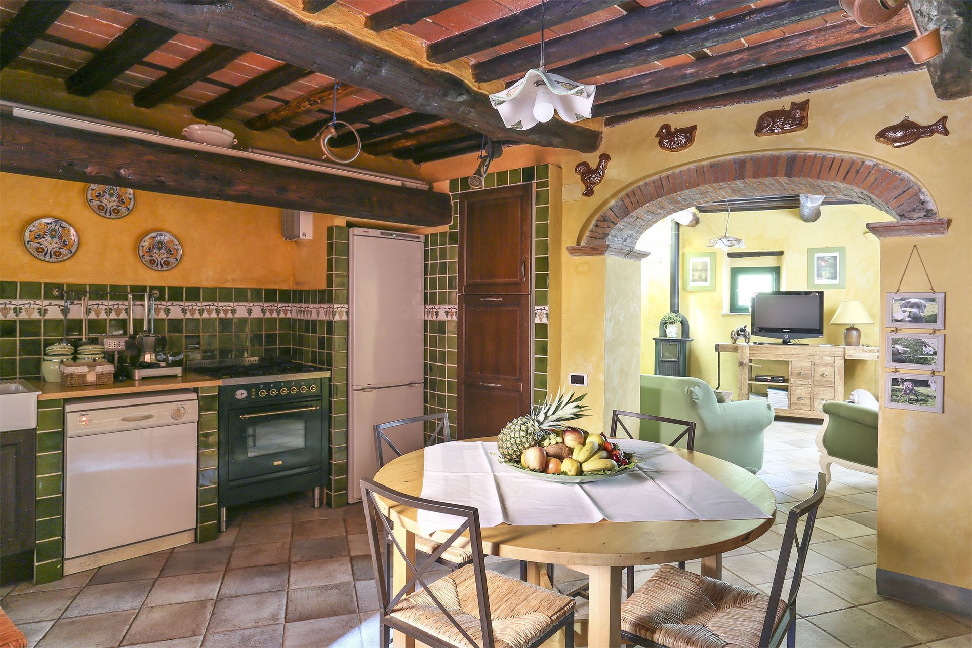 Rez-de-chaussée: entrée, séjour (TV satellite - radio) avec accès au premier étage, cuisine ouverte (four, freezer, petit micro ondes, lave-vaisselle, lave-linge machine à café avec filtre, fer et planche à repasser) avec table pour les repas (6 personnes) et accès sur l’extérieur.