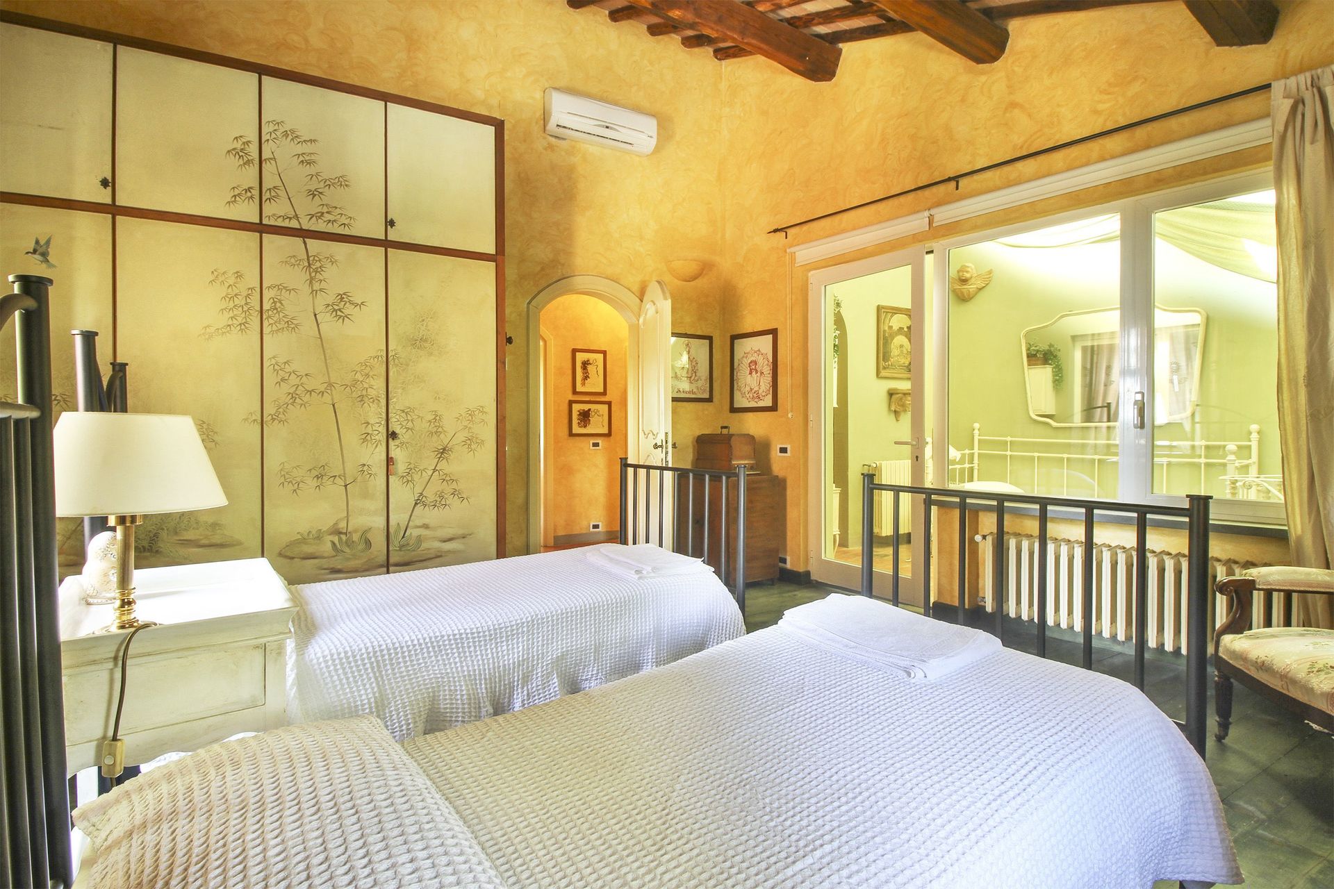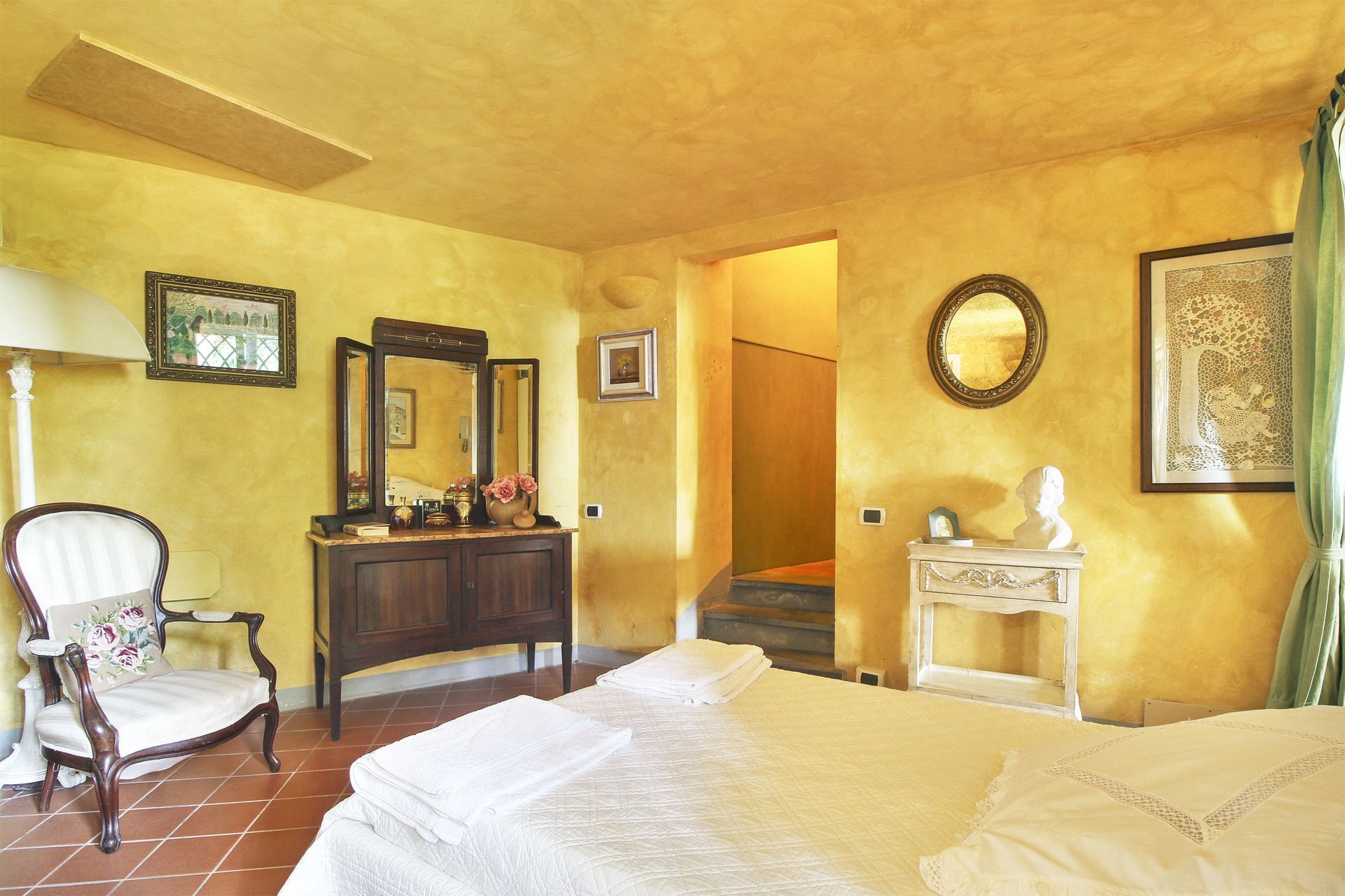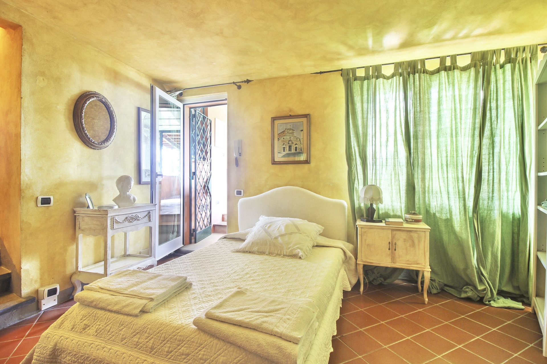 premier étage (accès par un escalier en colimaçon ou par l’extérieur): petit salon/chambre à coucher avec un lit à une place et demie et accès sur une petite véranda (5m2) fermée (vitrée) avec une table pour deux personnes, petit coin-cuisine de passage (petit four électrique, freezer) avec accès sur la petite véranda, une grande chambre double avec accès sur une terrasse couverte (10m2) et salle de bains privée avec douche, une chambre avec deux lits à une place, une chambre de passage avec un lit à une place (fenêtre dans le toit), salle de bains avec baignoire. Air conditionné dans les deux chambres à coucher principales et la petite véranda.