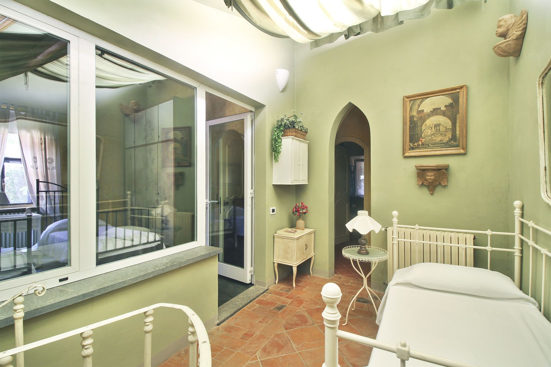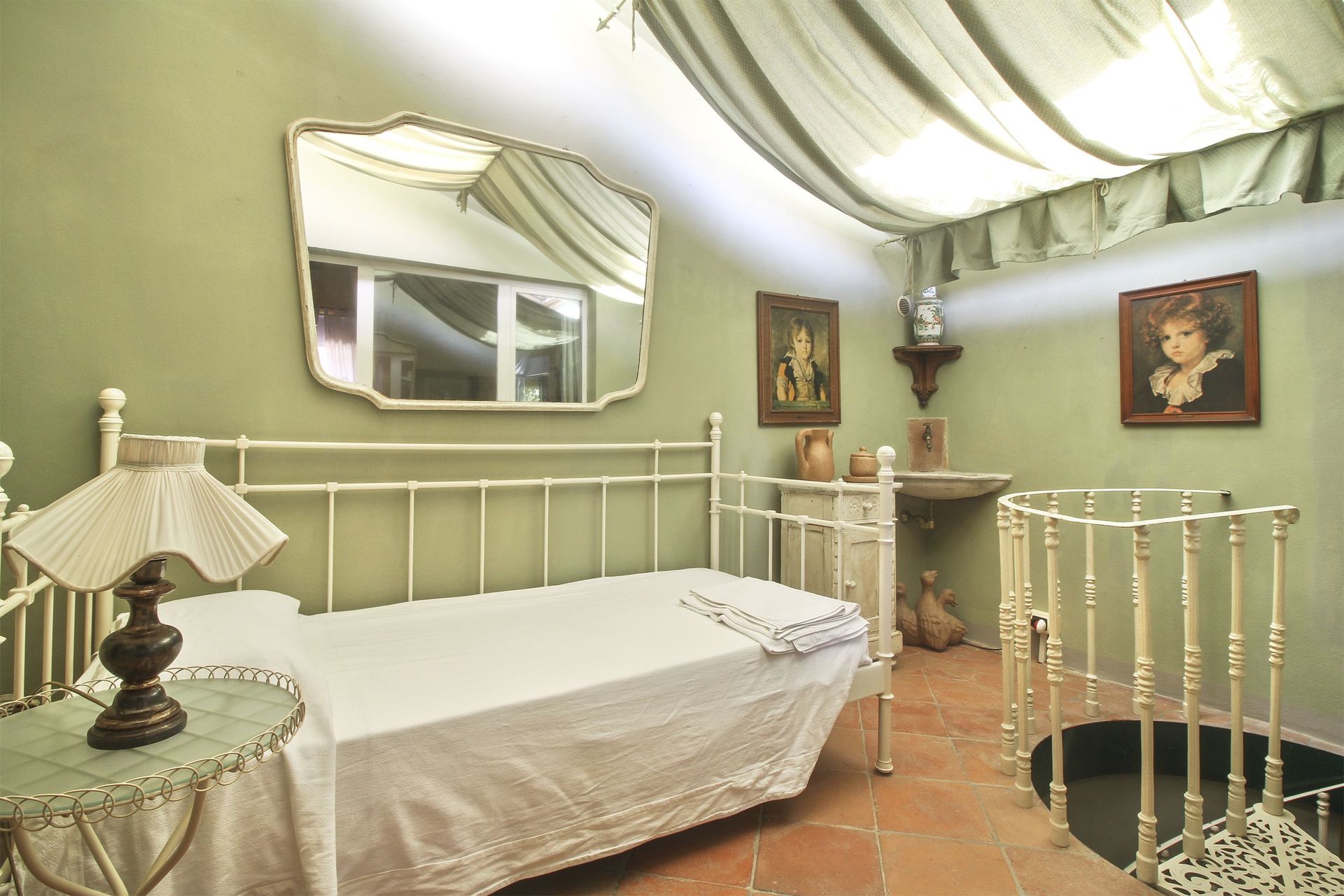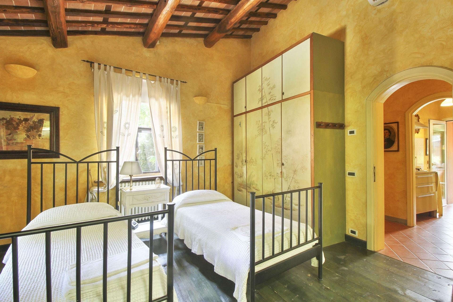 premier étage (accès par un escalier en colimaçon ou par l’extérieur): petit salon/chambre à coucher avec un lit à une place et demie et accès sur une petite véranda (5m2) fermée (vitrée) avec une table pour deux personnes, petit coin-cuisine de passage (petit four électrique, freezer) avec accès sur la petite véranda, une grande chambre double avec accès sur une terrasse couverte (10m2) et salle de bains privée avec douche, une chambre avec deux lits à une place, une chambre de passage avec un lit à une place (fenêtre dans le toit), salle de bains avec baignoire. Air conditionné dans les deux chambres à coucher principales et la petite véranda.