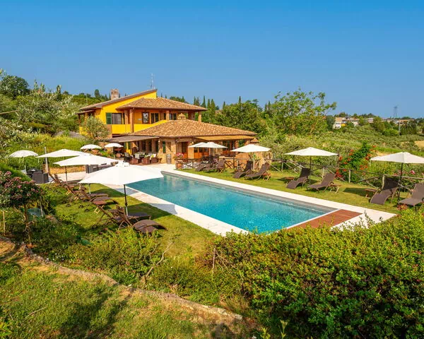 À disposition des hôtes : grands espaces extérieurs équipés (chaises longues et parasols), piscine en position panoramique (15 x 5m – prof. : 1,50/2 m) avec accès facile, 6 chambres (air conditionné) avec salle de bains privée et espace extérieur aménagé; salle de bains proche de la piscine; douche extérieure, zones-détente; barbecue et four à pizza; potager, ping-pong, badminton, billard. Connexion Internet Wi-Fi disponible, TV-Sat, lave-linge; aire de jeux pour enfants ,parking couvert avec possibilité de recharger les voitures électriques.