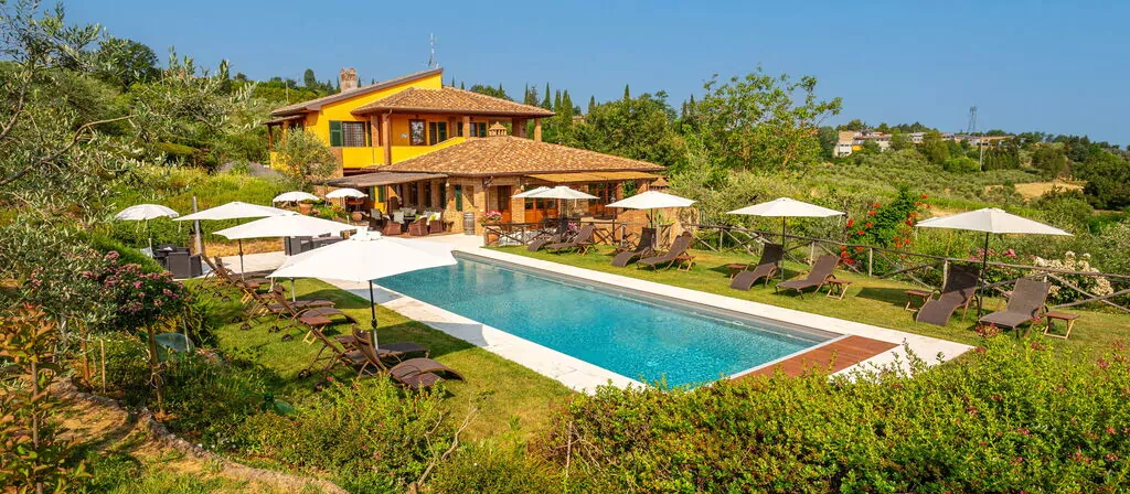 Partie d'une villa entièrement rénovée avec piscine pour vos vacances en Toscane: la propriété jouit d’une position tranquille et panoramique sur les collines des alentours de la petite ville de Montaione, à 50 km de Florence.