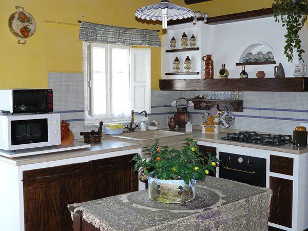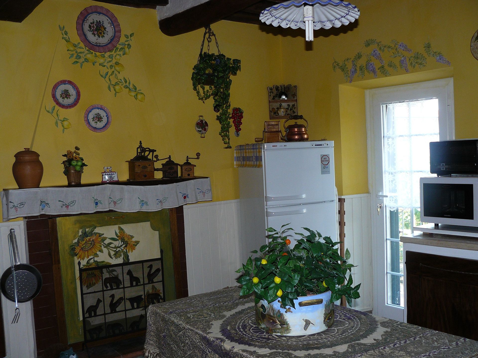 La cuisine, ample, est dotée d'une belle cheminée, mais aussi d'un réfrigérateur avec compartiment congélateur, d'un four à micro-ondes et électrique, d'un fer et de sa table, d'un grille-pain, d'un presse-fruits électriques et d'un mixer. L'ambiance y est également particulière, grâce à ses décorations de terre cuite, ses plats, casseroles et vaisselles anciens, ses meubles originaux, en châtaigniers, récemment restaurés afin de leur rendre leurs couleurs anciennes. Il s'agit surtout d'un vaissellier et d'une table au plan escamotable contenant le linge de cuisine, ce dernier également original, de chanvre, brodé à la main.