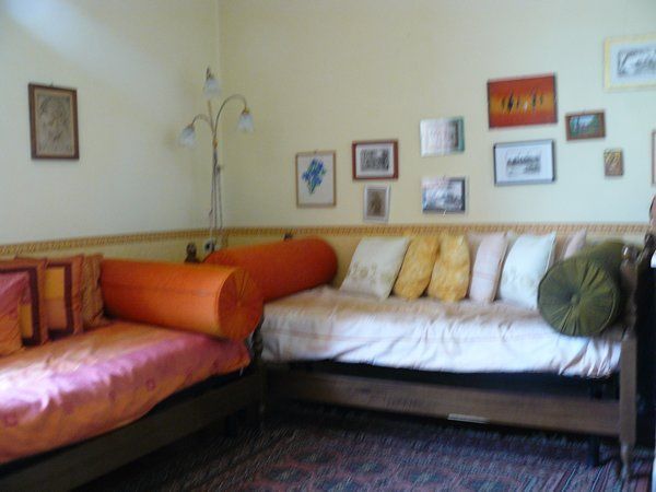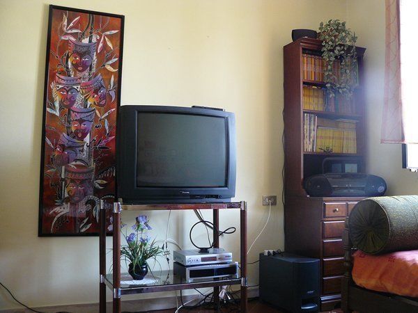 Le salon, près de la cuisine, est doté d'un grand appareil de télévision relié au satellite, d'une chaîne stéréo avec cd, lecteur dvd et appareil vidéo VHS. Les deux canapés se transforment en lits simples. C'est une pièce agréable, bien aérée et très colorée...