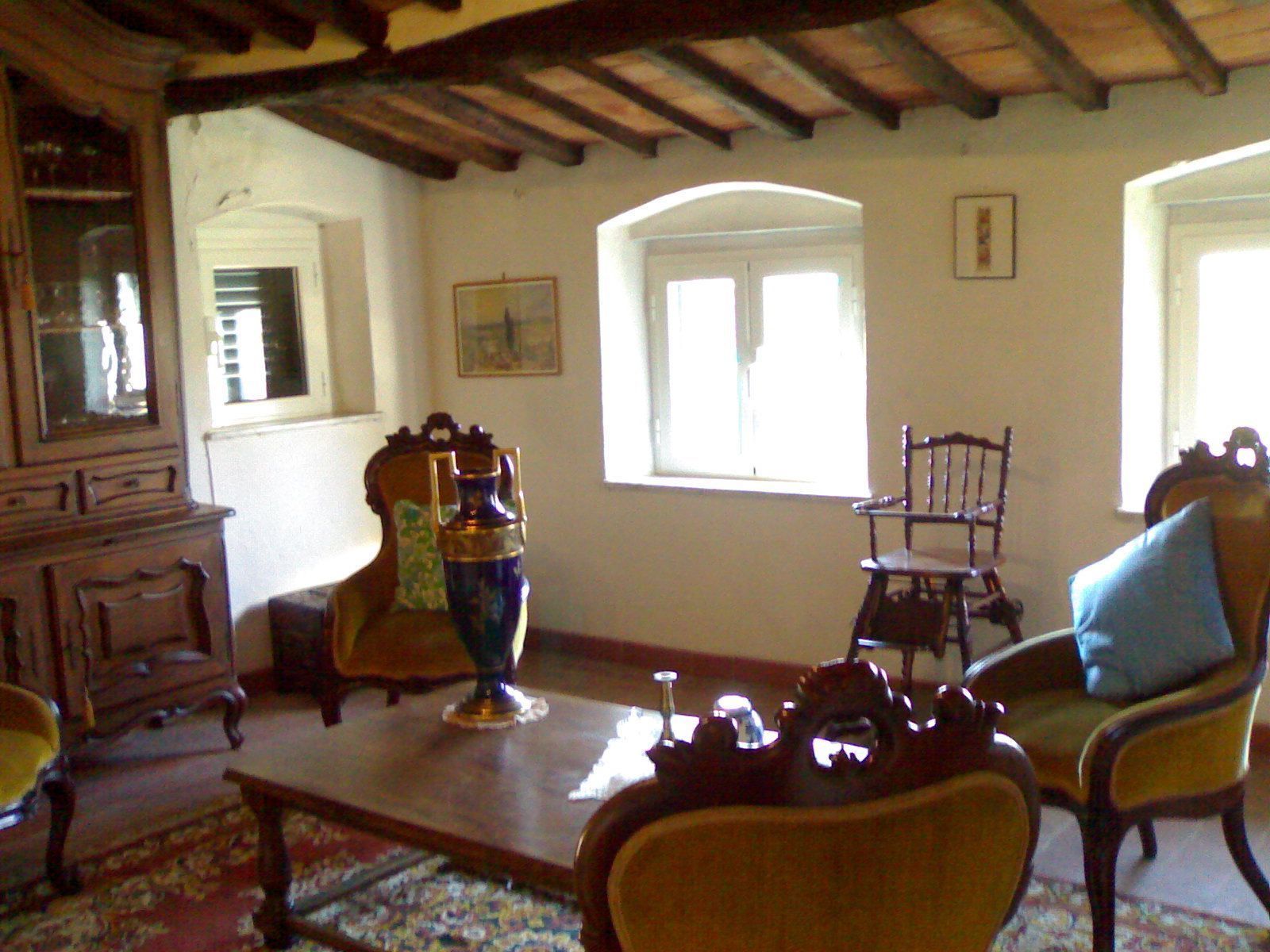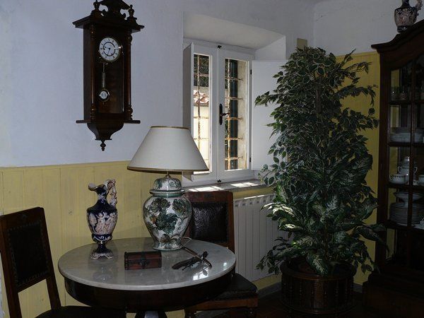 La maison possède 3 niveaux. De la petite cour devant la propriété, on accède directement à l'ample salon, meublé avec goût et style de pièces anciennes. Au même niveau, on trouve la grande cuisine, de style rustique, avec une belle cheminée murale, puis ensuite à la véranda extérieure et au jardin. La cuisine est jouxtée de toilettes et d'un salon.