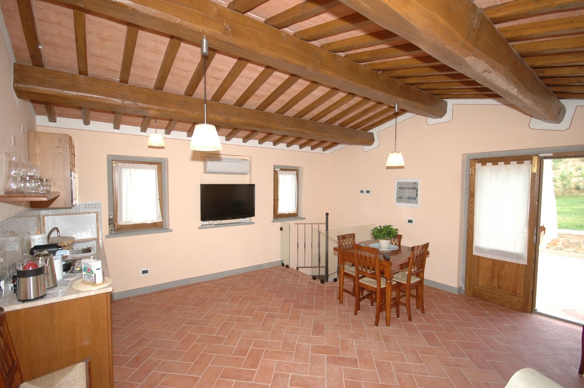 Rez-de-chaussée : séjour/salle à manger (TV) avec coin-cuisson (petit four à micro-ondes, grille-pain, machine à café, presse-citrons). Du séjour, accès au niveau inférieur par un escalier en colimaçon.