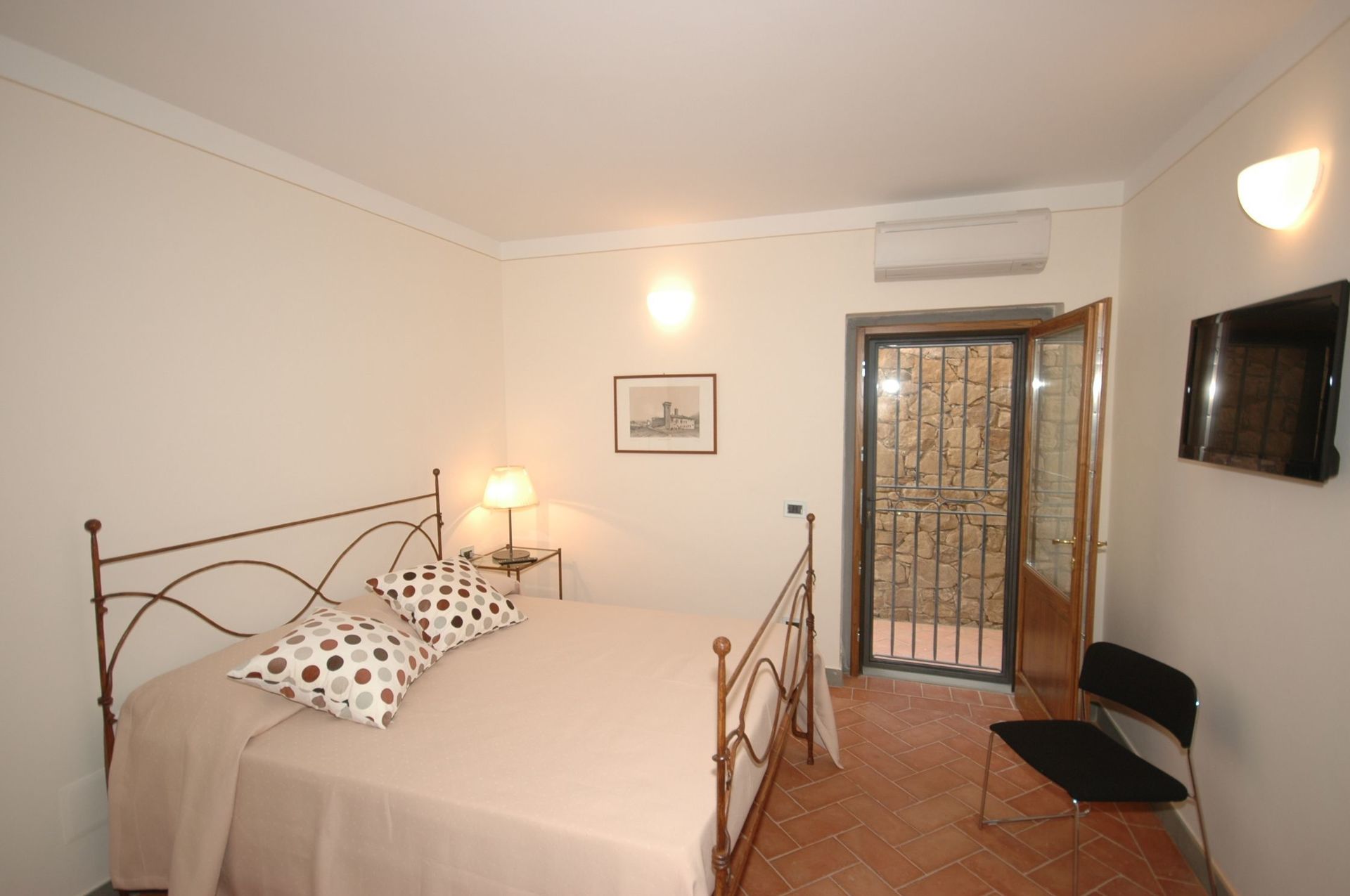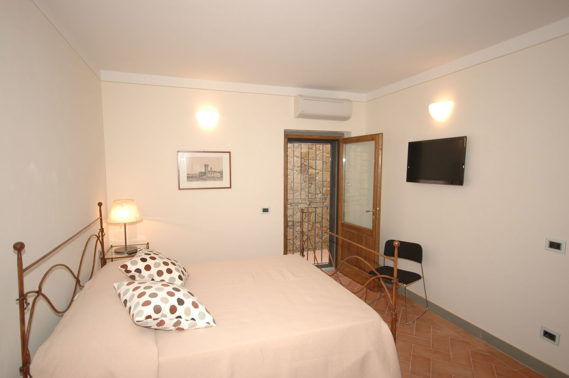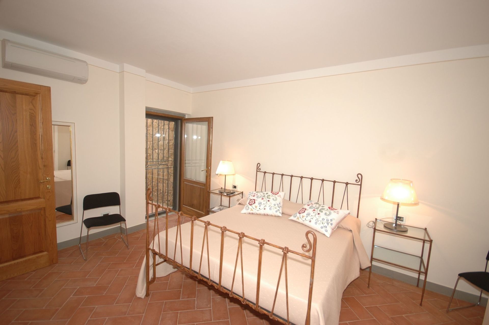 Niveau inférieur (accessible également de l’extérieur) : une chambre double, une chambre double avec salle de bains privée avec douche, salle de bains avec douche. Les deux chambres ont accès sur l’extérieur.