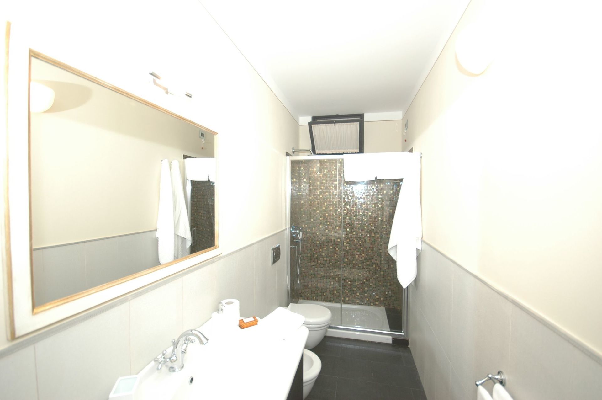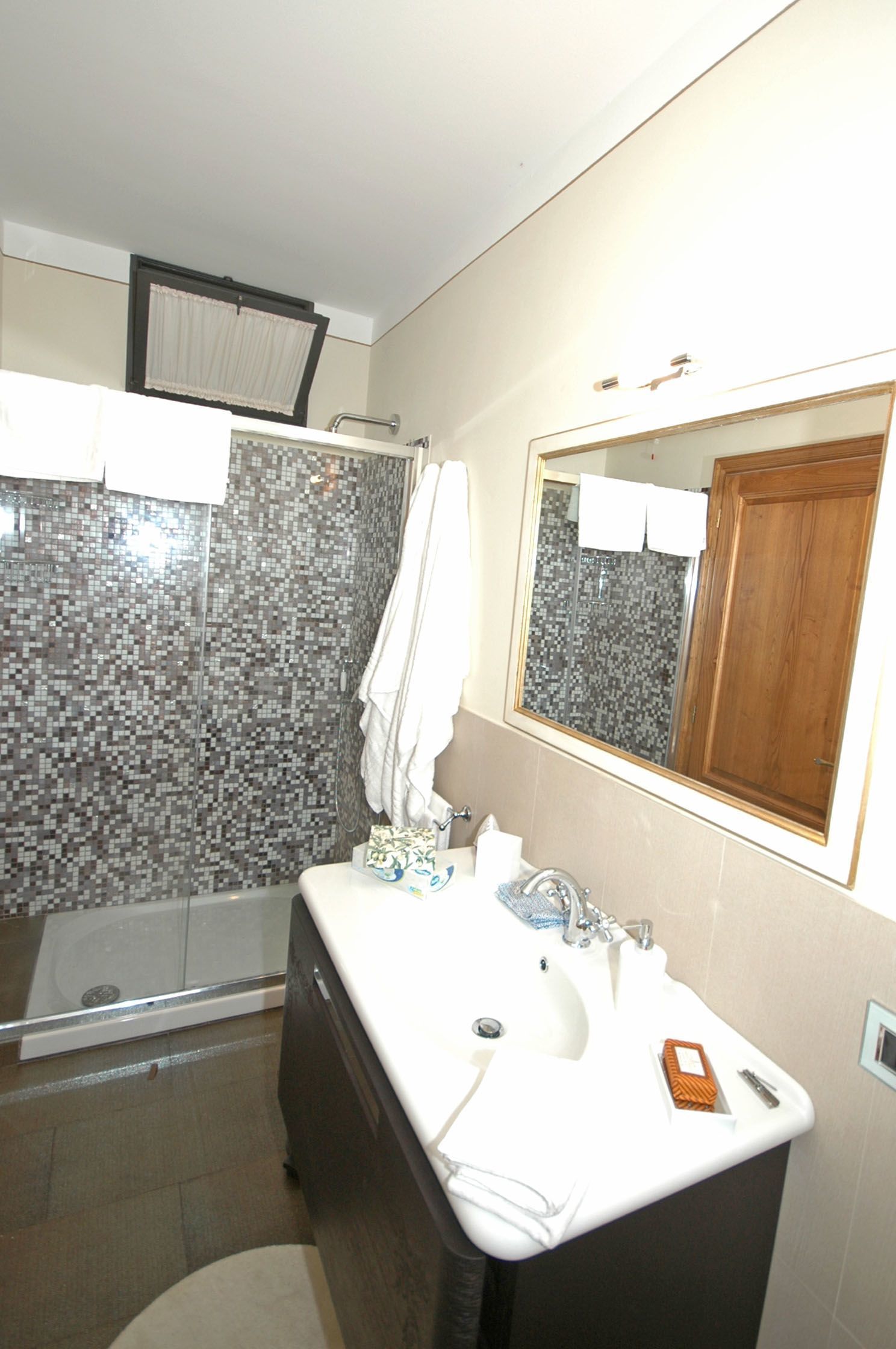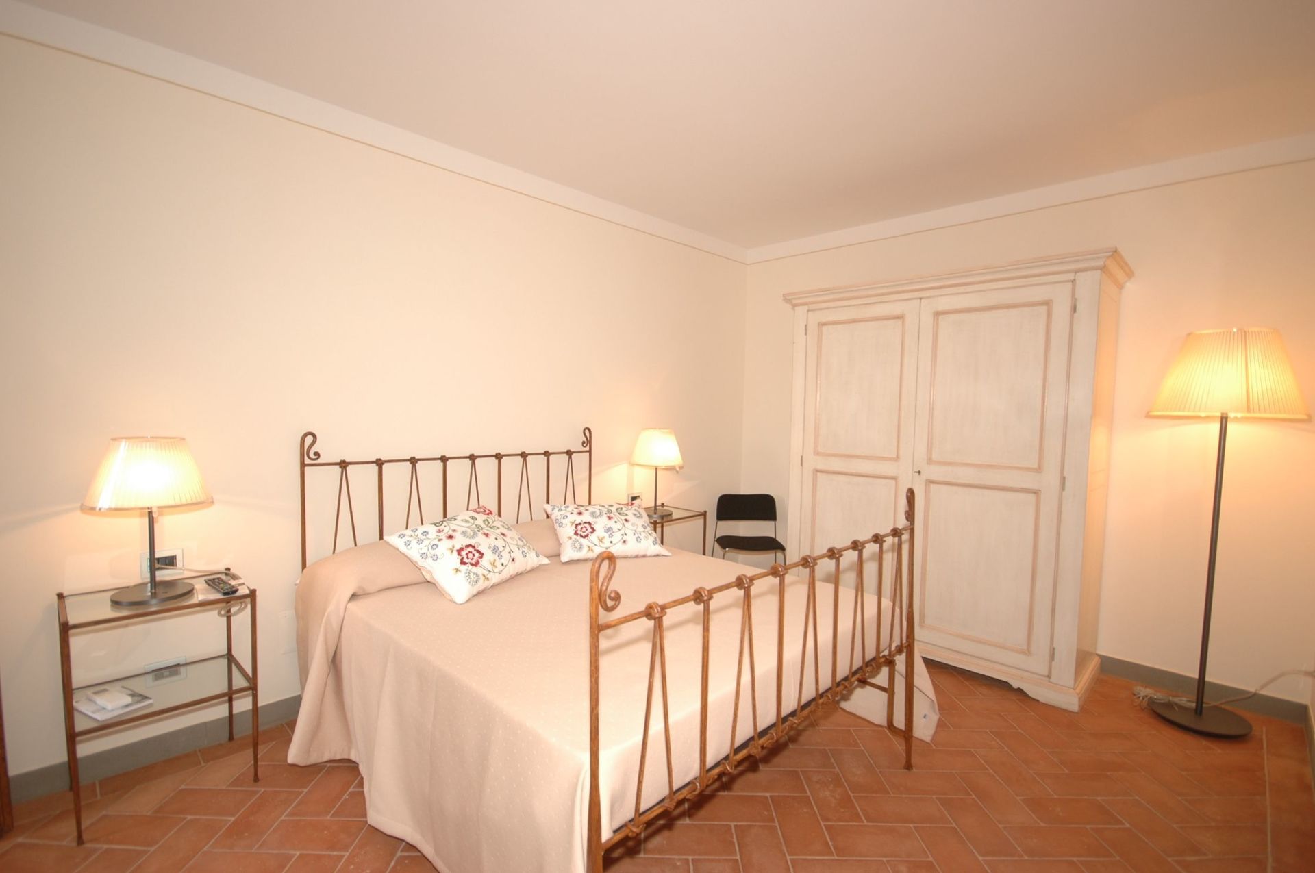 Niveau inférieur (accessible également de l’extérieur) : une chambre double, une chambre double avec salle de bains privée avec douche, salle de bains avec douche. Les deux chambres ont accès sur l’extérieur.
