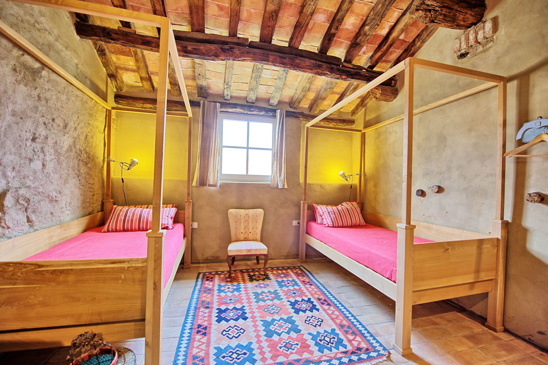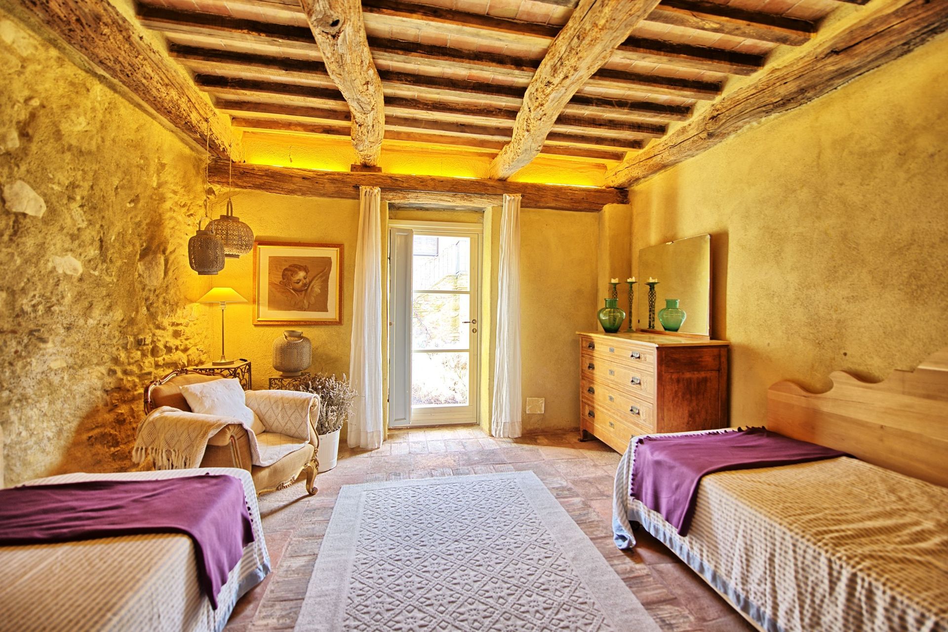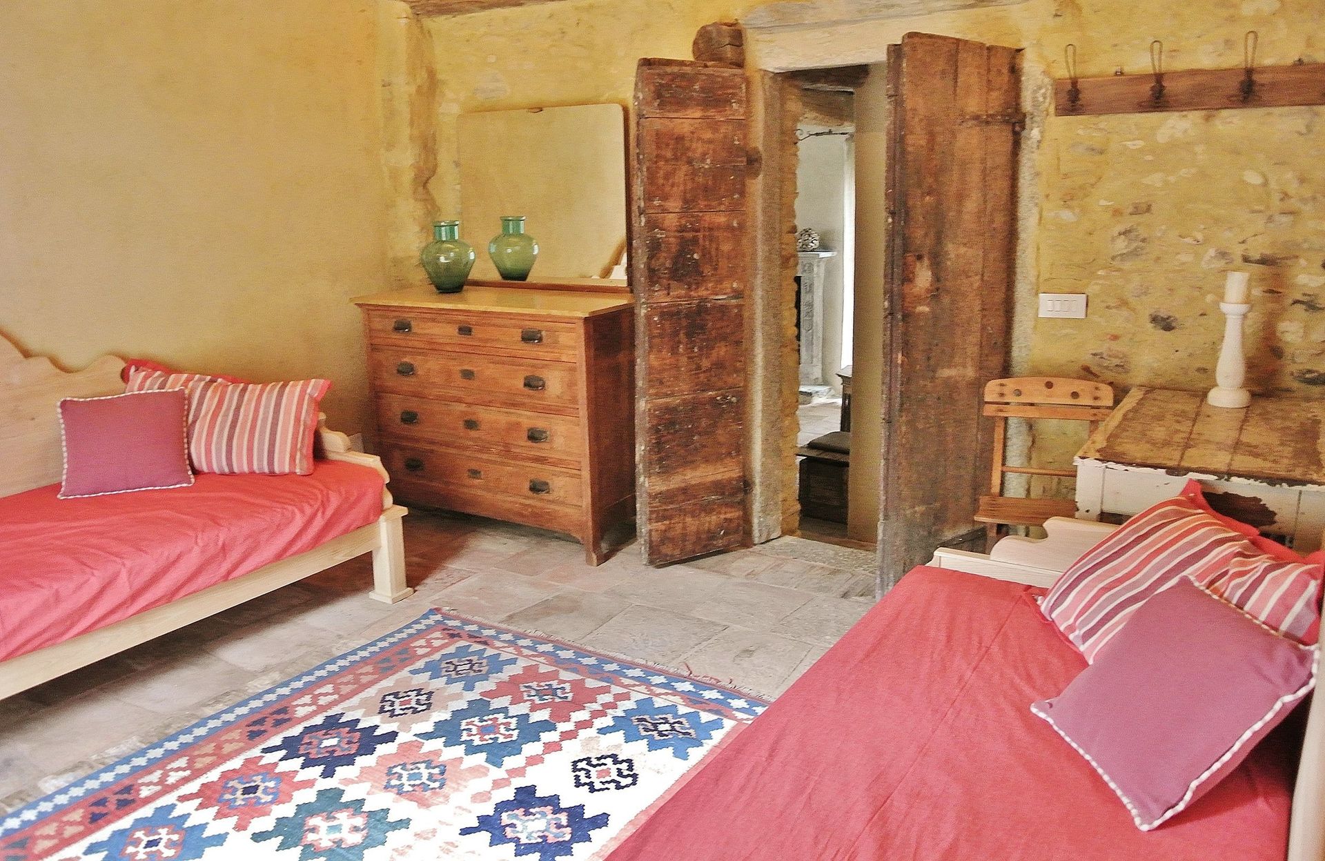 2 marches plus haut (du séjour): une chambre avec 2 lits à une place (peuvent être unis sur demande) avec accès sur l’extérieur.