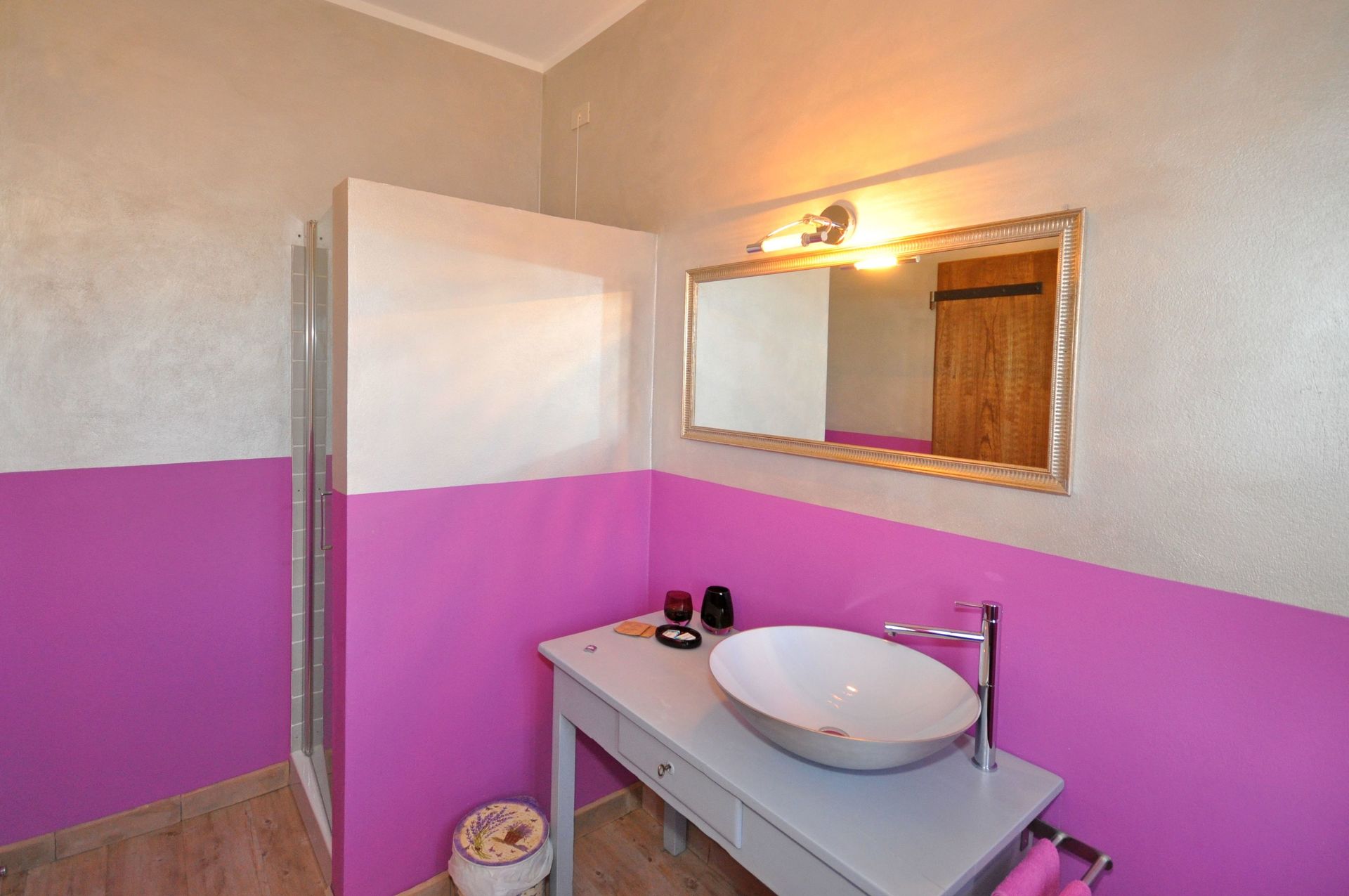 Rez-de-chaussée : une chambre double (accessible que de l’extérieur) avec salle de bains privée avec douche (sans fenêtre). Petite buanderie (lave-linge, fer et table à repasser).
