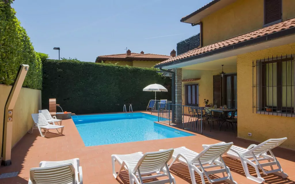 "Villa Giada", maison 7 pièces 250 m2 sur 3 niveaux, au rez-de-chaussée. Aménagement confortable et de bon goût: entrée. Grand séjour/salle à manger avec cheminée et TV (satellite). Sortie sur la piscine. 1 chambre avec 2 lits. Cuisine ouverte (4 plaques de cuisson, four, lave-vaisselle). Douche/bidet/WC. À l'étage supérieur: 2 chambres doubles. Sortie sur la terrasse. 1 chambre avec 1 x 2 lits superposés. Bain/bidet/WC, douche/bidet/WC. 2ème étage: 1 chambre avec 2 lits. Sortie sur la terrasse. A disposition: lave-linge. 1 animal/ chien autorisé.