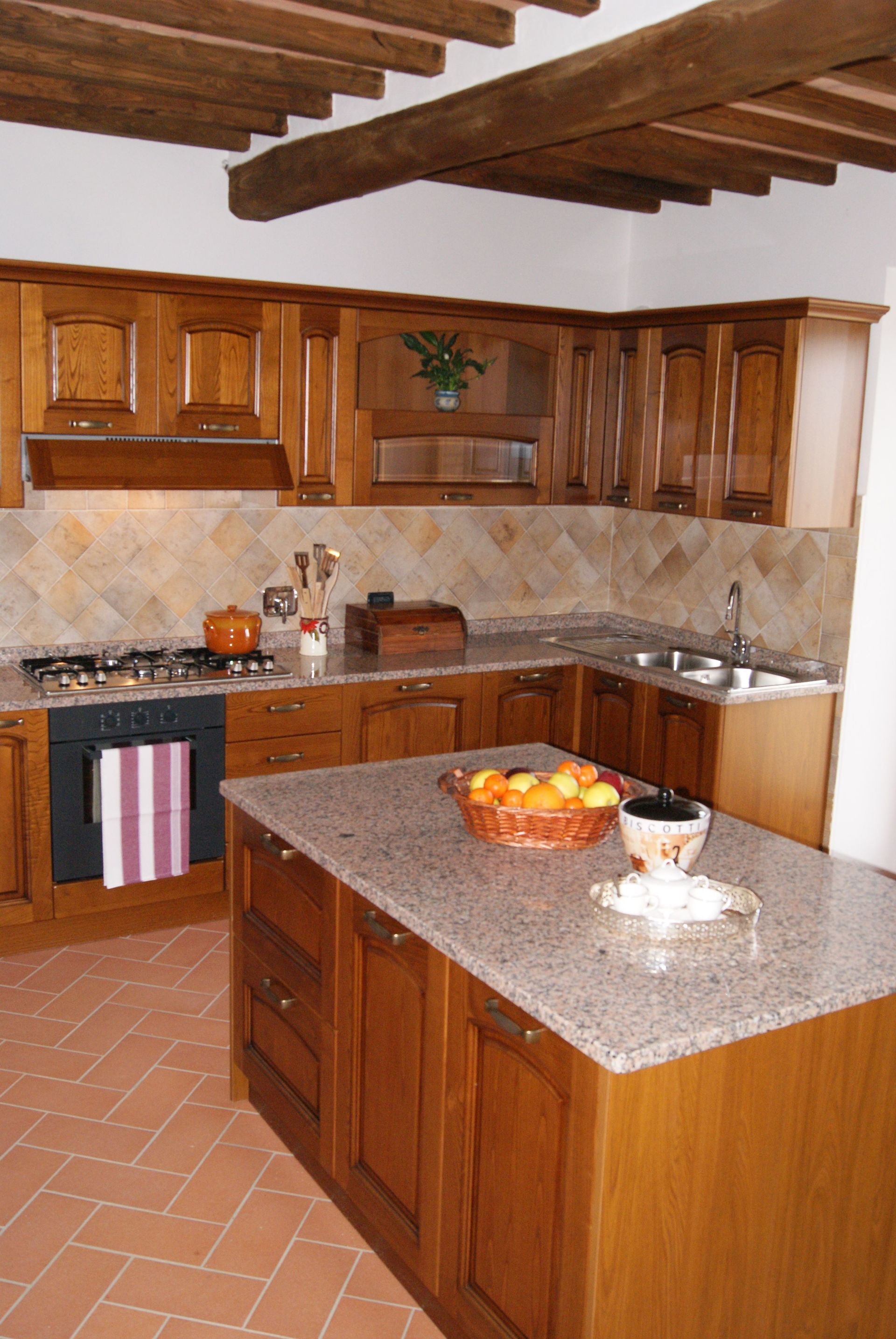 there is a big living room with a reading corner, TV and DVD reader and a fireplace; a dining room and a kitchen (microwave, electric oven, gas hob, dishwasher, toaster, kettle, fridge and freezer) where you can easily move thanks to a island in the middle of the room.