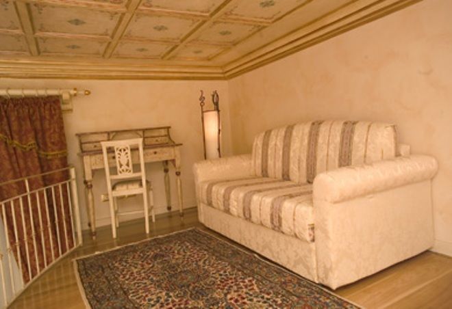 The lower level contains a carved sofa and two matching arm-chairs, sat TV, DVD player, telephone. Stylish florentine floor-to-ceiling drapes, cover an immense window. An open wooden staircase, leads up to the semi-circular mezzanine level, furnished with a double sofa-bed and a writing table.