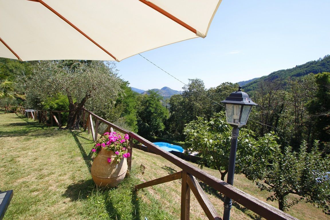 On 2 levels - the house has a garden area with dining table and sun umbrella - nice view down to the pool and over the hills of the Garfagnana.